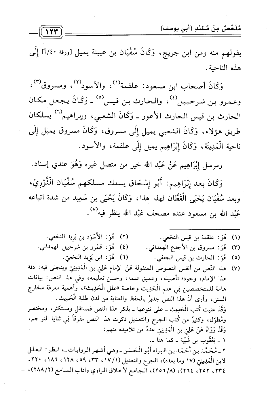 وكان بعد إبراهيم: أبو إسحاق يسلك مسلكهم سفيان الثوري، وبعد سفيان يحيى القطان فهذا هذا، وكان يحيى بن سعيد من شدة اتباعه عبد الله بن مسعود عنده مصحف عبد الله ينظر فيه.
