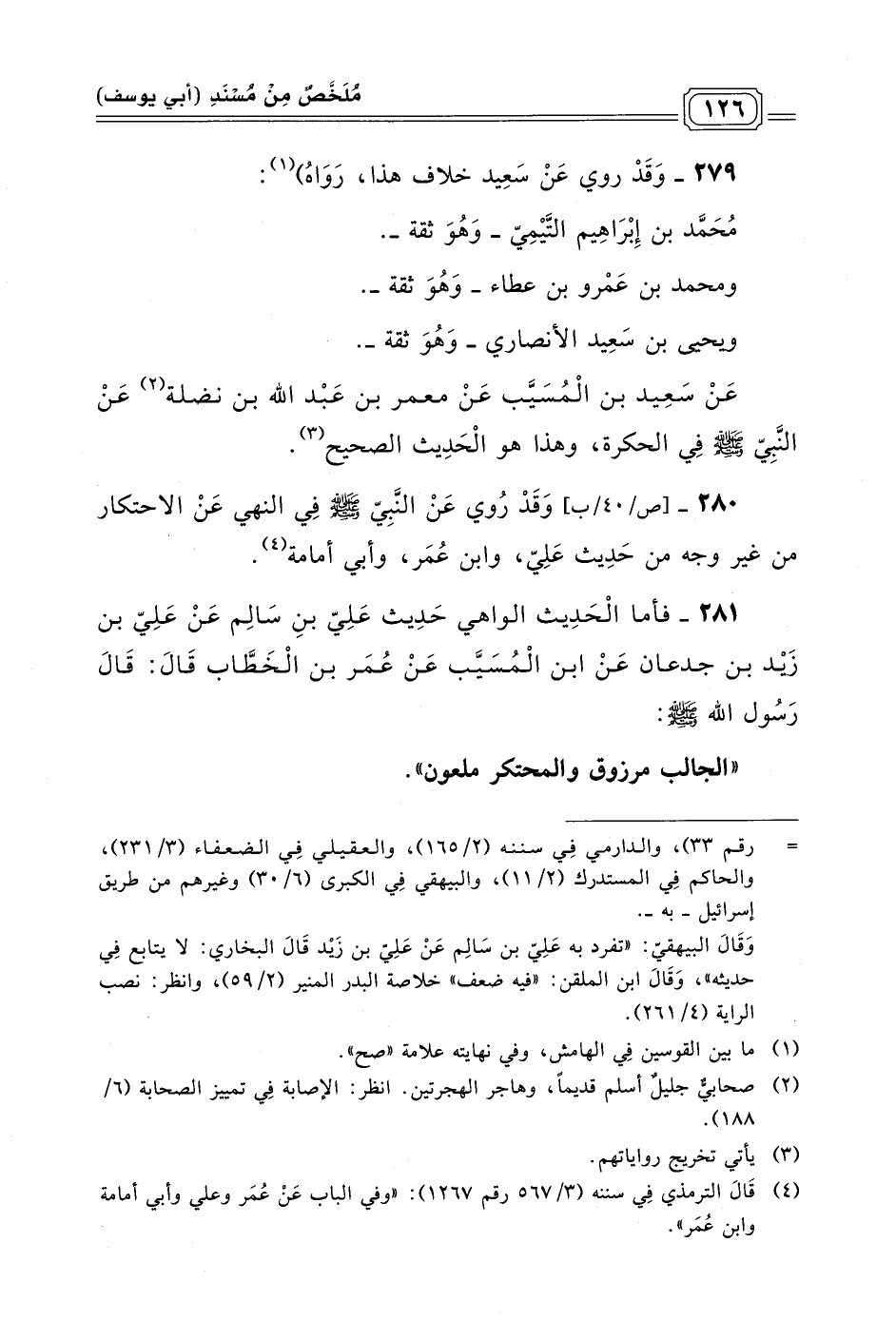عن سعيد بن المسيب عن معمر بن عبد الله بن نضلة عن النبي صلى الله عليه وسلم في الحكرة، وهذا هو الحديث الصحيح.