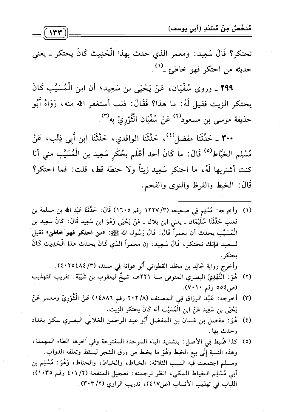 299 - وروى سفيان، عن يحيى بن سعيد؛ أن ابن المسيب كان يحتكر الزيت فقيل له: ما هذا؟ فقال: ذنب أستغفر الله منه، رواه أبو حذيفة موسى بن مسعود عن سفيان الثوري به.