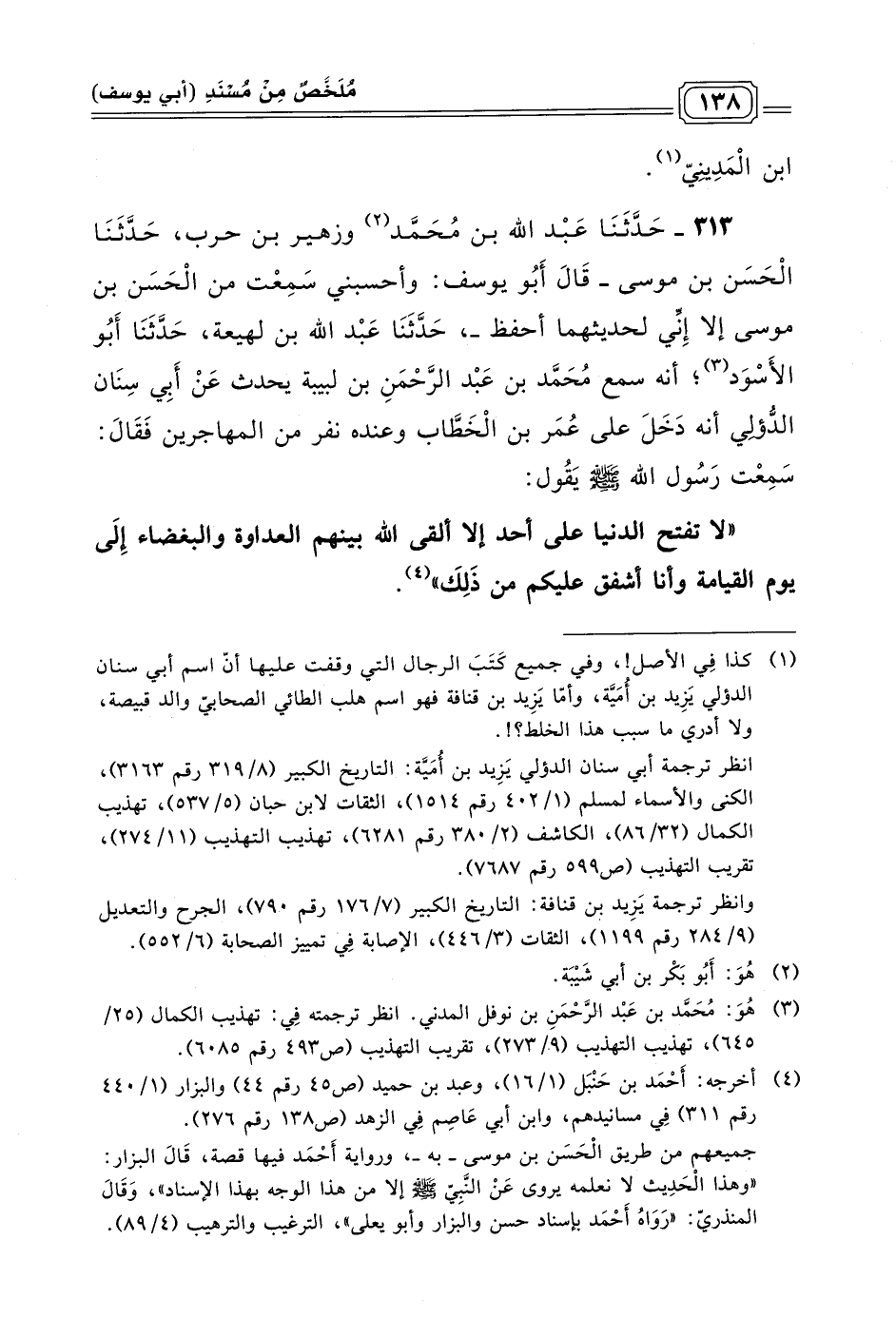 313 - حدثنا عبد الله بن محمد وزهير بن حرب، حدثنا الحسن بن موسى –قال أبو يوسف: وأحسبني سمعت من الحسن بن موسى إلا إني لحديثهما أحفظ-، حدثنا عبد الله بن لهيعة، حدثنا أبو الأسود؛ أنه سمع محمد بن عبد الرحمن بن لبيبة يحدث عن أبي سنان الدؤلي أنه دخل على عمر بن الخطاب وعنده نفر من المهاجرين فقال: سمعت رسول الله صلى الله عليه وسلم يقول: