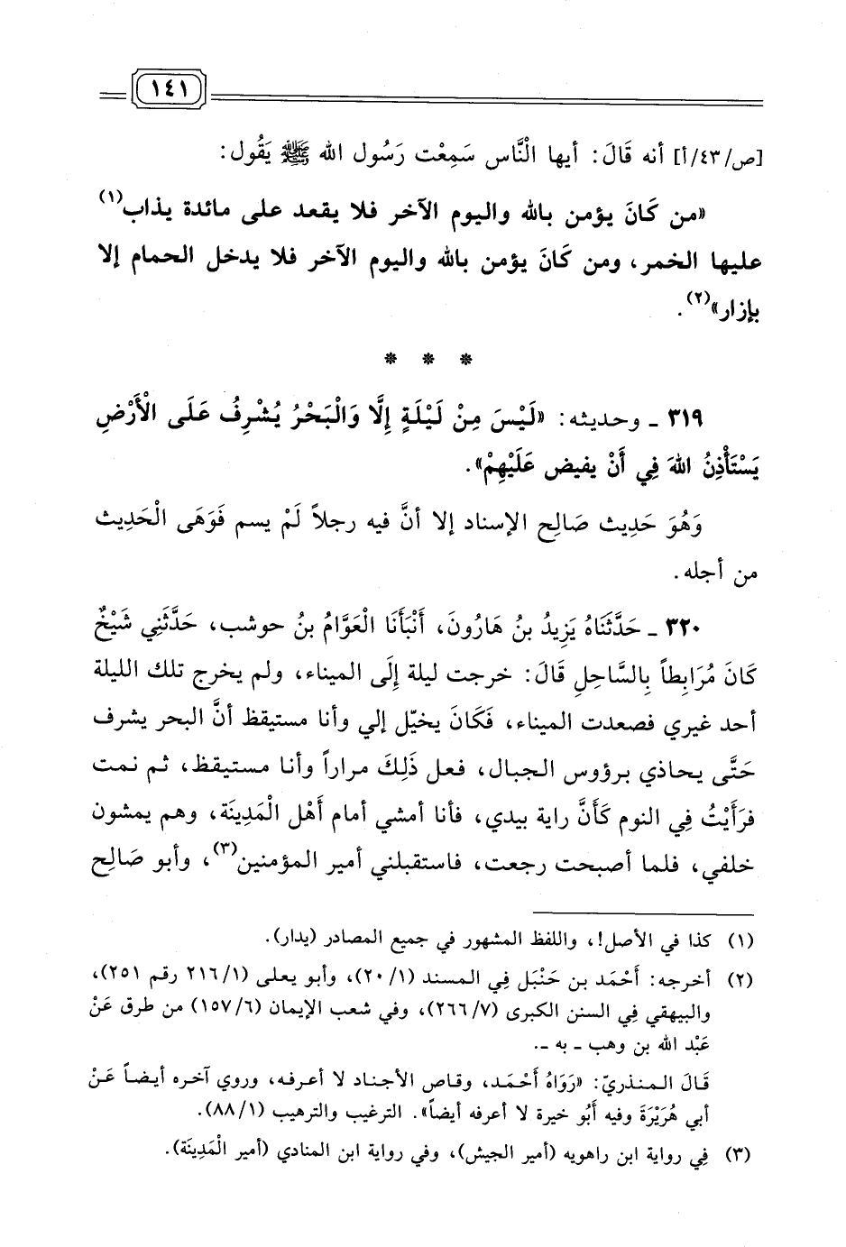 320 - حدثناه يزيد بن هارون، أنبأنا العوام بن حوشب، حدثني شيخ كان مرابطا بالساحل قال: خرجت ليلة إلى الميناء، ولم يخرج تلك الليلة أحد غيري فصعدت الميناء، فكان يخيل إلي وأنا مستيقظ أن البحر يشرف حتى يحاذي برؤوس الجبال، فعل ذلك مرارا وأنا مستيقظ، ثم نمت فرأيت في النوم كأن راية بيدي، فأنا أمشي أمام أهل المدينة، وهم يمشون خلفي، فلما أصبحت رجعت، فاستقبلني أمير المؤمنين، وأبو صالح