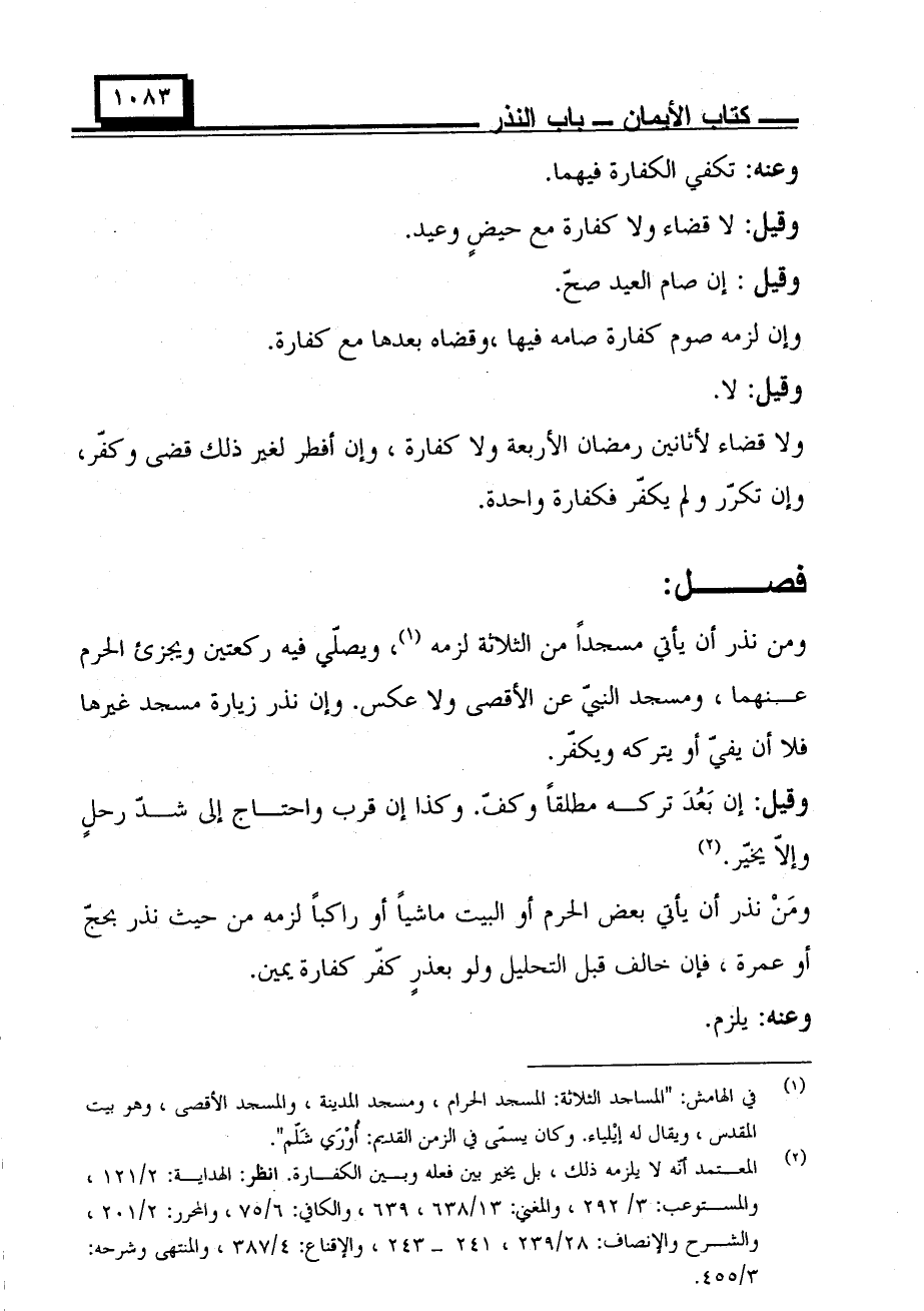 ومن نذر أن يأتي مسجدًا من الثلاثة لزمه، ويصلي فيه ركعتين ويجزئ الحرم عنهما، ومسجد النبي عن الأقصى ولا عكس، وإن نذر زيارة مسجد غيرها فلا أن يفي أو يتركه ويكفر.