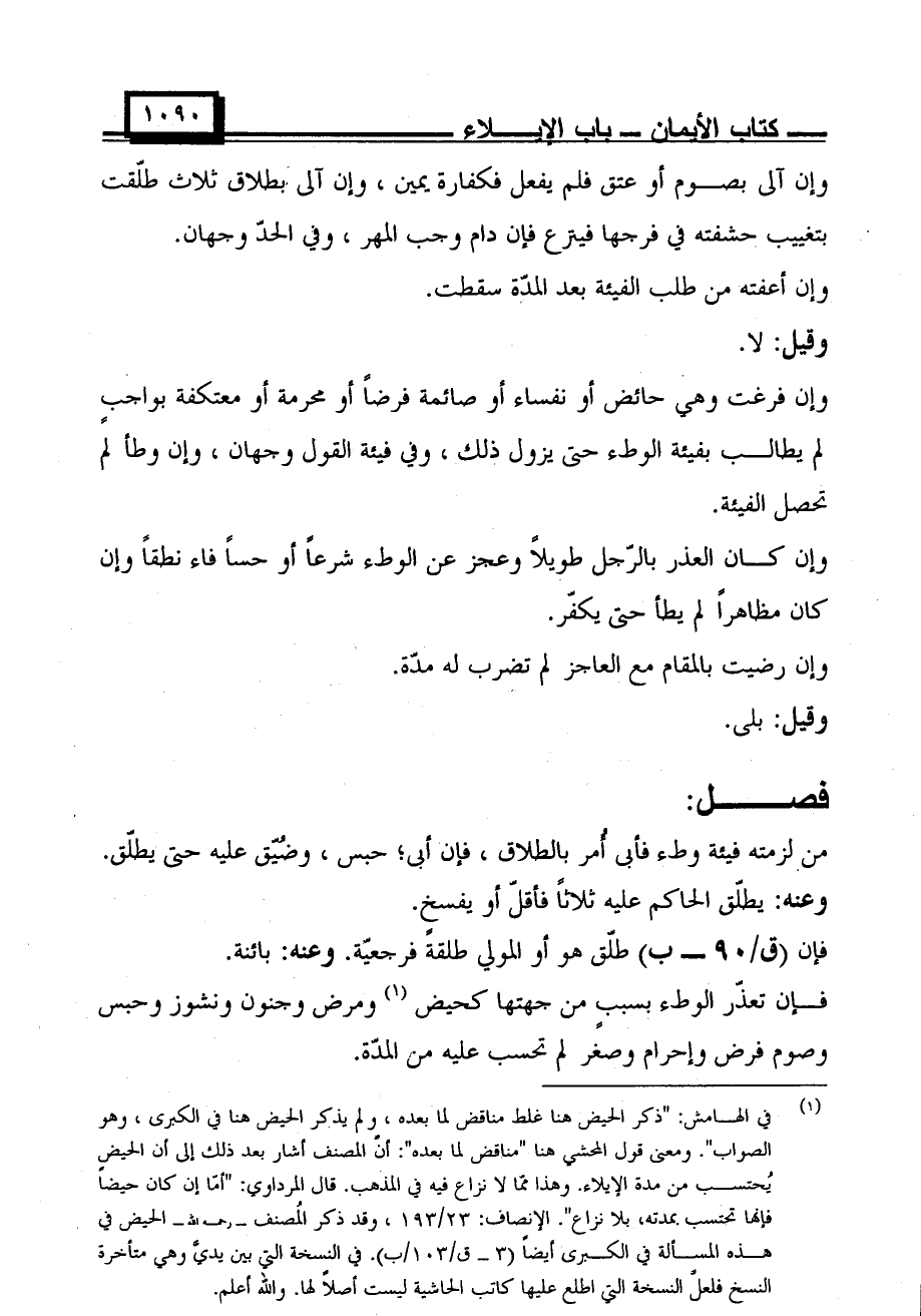 وإن فرغت وهي حائض أو نفساء أو صائمة فرضًا أو محرمة أو معتكفة بواجبٍ لم يطالب بفيئة الوطء حتى يزول ذلك، وفي فيئة القول وجهان، وإن وطأ لم تحصل الفيئة.