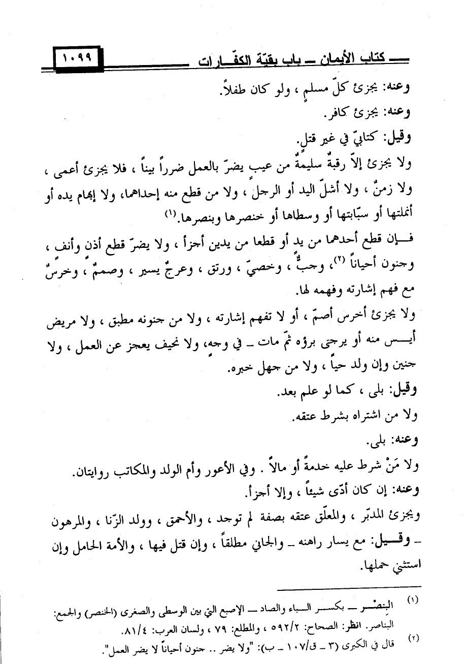 ولا يجزئ إلا رقبةٌ سليمةٌ من عيب يضر بالعمل ضررًا بينًا، فلا يجزئ أعمى، ولا زمنٌ، ولا أشل اليد أو الرجل، ولا من قطع منه إحداهما، ولا إبهام يده أو أنملتها أو سبابتها أو وسطاها أو خنصرها وبنصرها.
