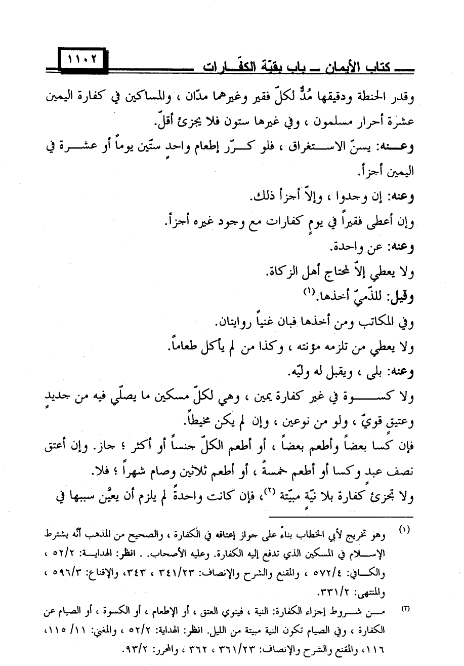 وقدر الحنطة ودقيقها مد لكل فقير وغيرهما مدان، والمساكين في كفارة اليمين عشرة أحرار مسلمون، وفي غيرها ستون فلا يجزئ أقل.