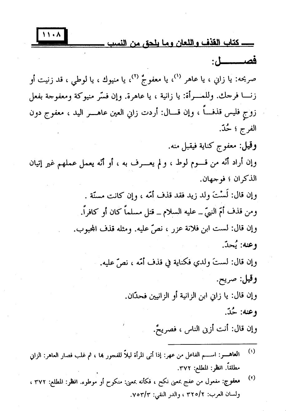 صريحه: يا زاني، يا عاهر، يا معفوج، يا منيوك، يا لوطي، قد زنيت أو زنا فرجك. وللمرأة: يا زانية، يا عاهرة. وإن فسر منيوكة ومعفوجة بفعل زوج فليس قذفا، وإن قال: أردت زاني العين عاهر اليد، معفوج دون الفرج؛ حد.
