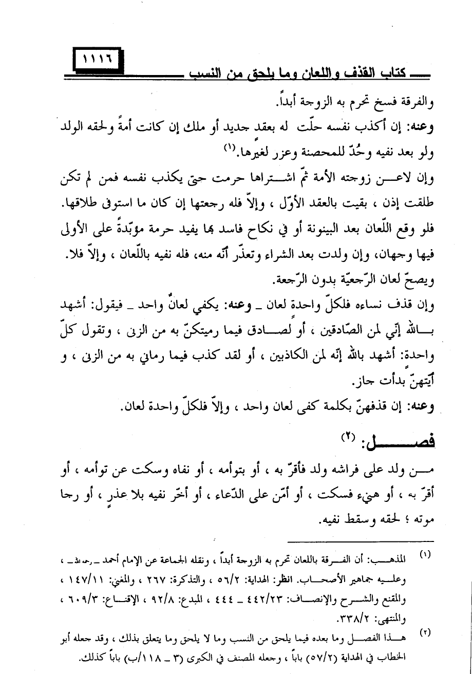 وإن لاعن زوجته الأمة ثم اشتراها حرمت حتى يكذب نفسه فمن لم تكن طلقت إذن، بقيت بالعقد الأول، وإلا فله رجعتها إن كان ما استوفى طلاقها. فلو وقع اللعان بعد البينونة أو في نكاح فاسد بها يفيد حرمة مؤبدة على الأولى فيها وجهان، وإن ولدت بعد الشراء وتذر أنه منه، فله نفيه باللعان، وإلا فلا. ويصح لعان الرجعية بدون الرجعة.
