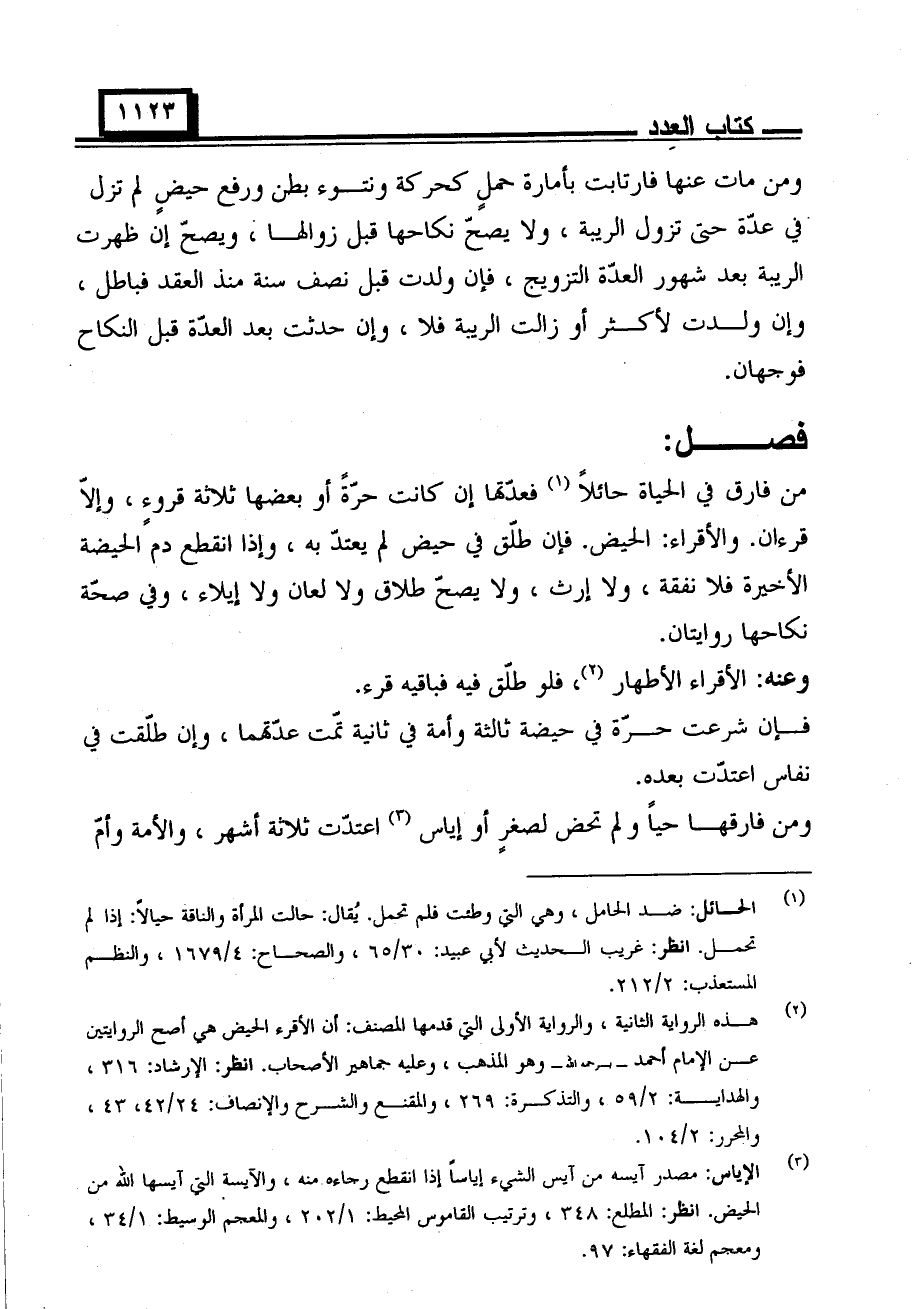 من فارق فيي الحياة حائلا فعدتها إن كانت حرة أو بعضها ثلاثة قروء، وإلا قراءان. والأقراء: الحيض. فإن طلق في حيض لم يعتد به، وإذا انقطع دم الحيضة الأخيرة فلا نفقة، ولا إرث، ولا يصح طلاق ولا لعان ولا إيلاء، وفي صحة نكاحها روايتان.