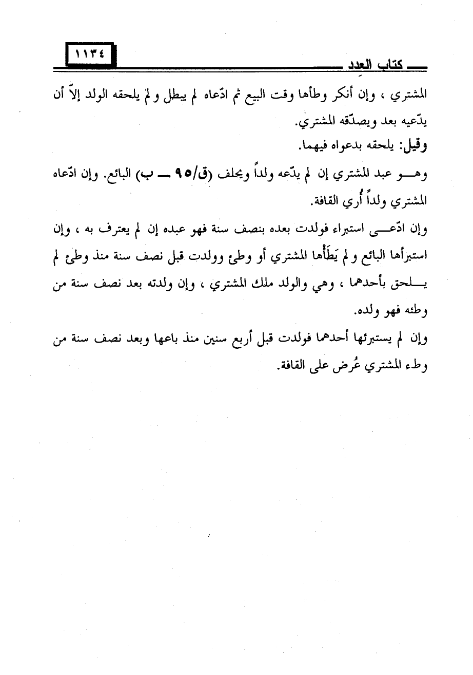 وإن ادعى استبراء فولدت بعده بنصف سنة فهو عبده إن لم يعترف به، وإن استبرأها البائع ولم يطأها المشتري او وطئ وولدت قبل نصف سنة منذ وطئ لم يلحق بأحدهما، وهي والولد ملك المشتري، وإن ولدته بعد نصف سنة من وطئه فهو ولده.