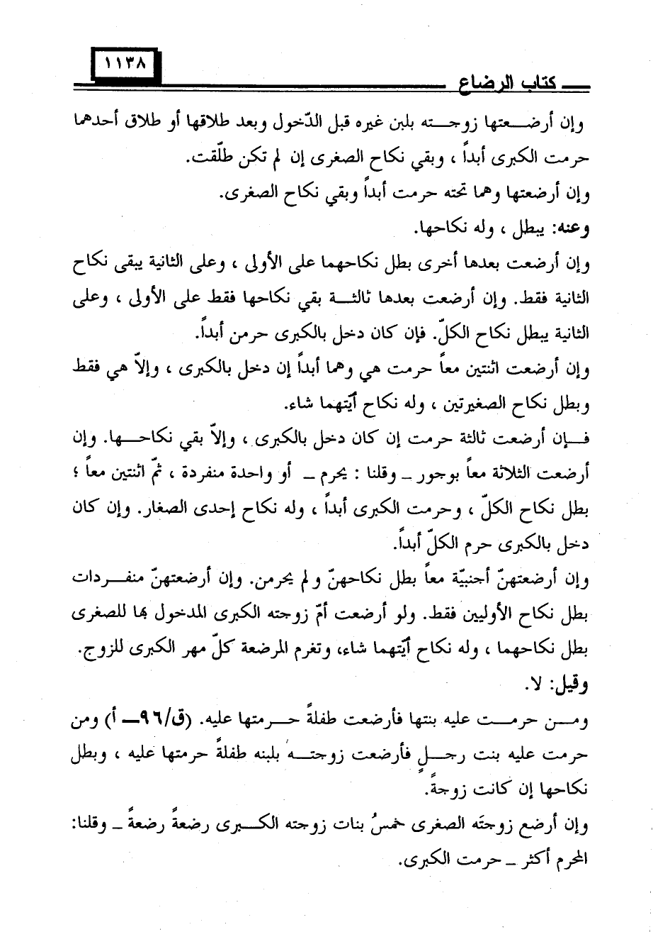 ومن حرمت عليه بنتها فأرضعت طفلة حرمتها عليه. (ق/٩٦ - أ) ومن حرمت عليه بنت رجل فأرضعت زوجته بلبنه طفلة حرمتها عليه، وبطل نكاحها إن كانت زوجة.