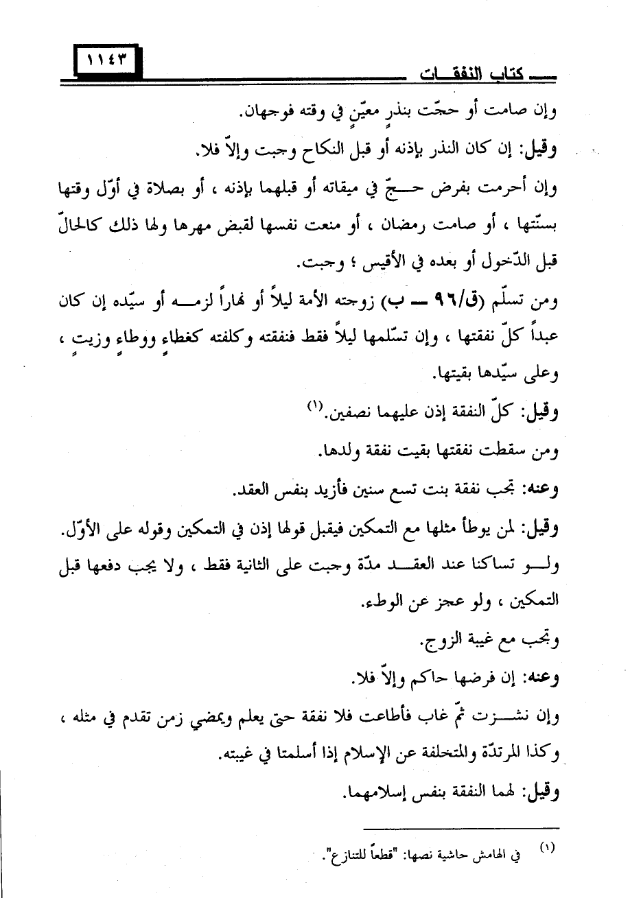 ومن تسلم (ق/٩٦ - ب) زوجته الأمة ليلا أو نهارا لزمه أو سيده إن كان عبدا كل نفقتها، وإن تسلمها ليلا فقط فنفقته وكلفته كغطاء ووطاء وزيت، وعلى سيدها بقيتها.