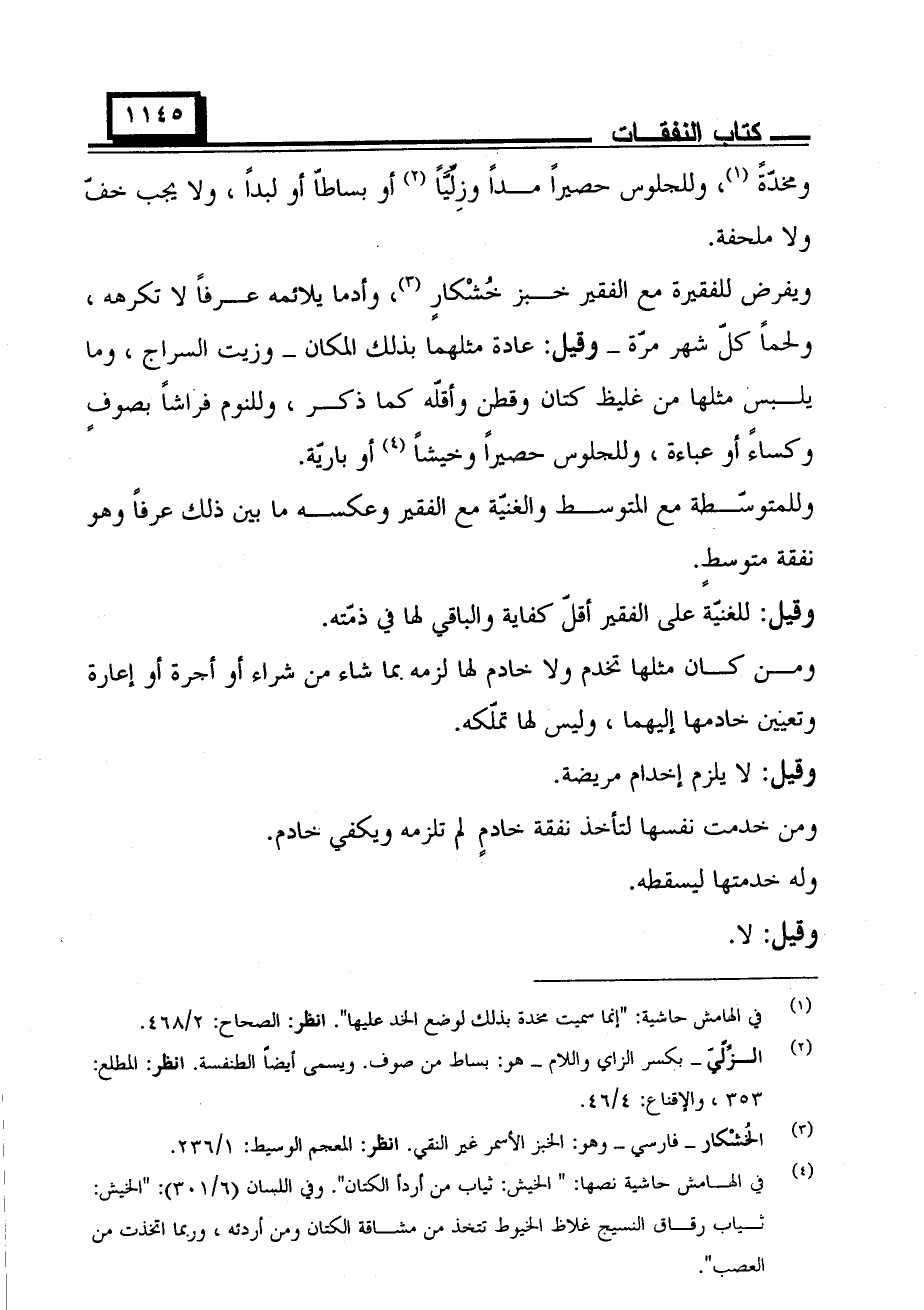 ويفرض للفقيرة مع الفقير خبز خشكار، وادما يلائمه عرفا لا تكرهه، ولحما كل شهر مرة- وقيل: عادة مثلهما بذلك المكان- وزيت السراج، وما يلبس مثلهما بذلك المكان- وزيت السراج، وما يلبس مثلها من غليظ كتان وقطن وأقله كما ذكر، وللنوم فراشا بصوف وكساء أو عباءة، وللجلوس حصيرا وخيشا أو بارية.