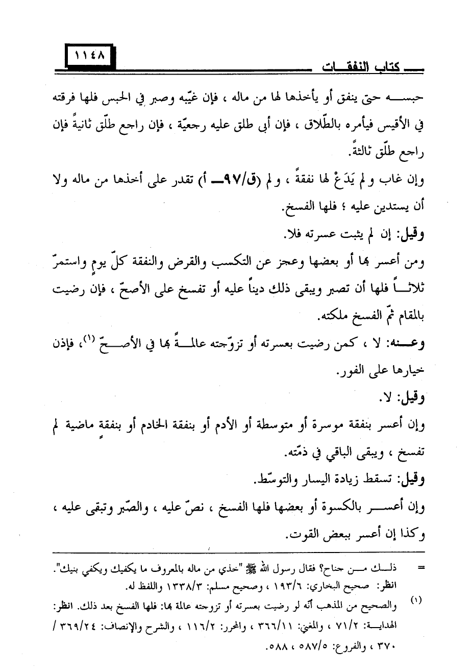 حبسه حتى ينفق أو يأخذها لها من ماله، فإن غيبه وصبر في الحبس فلها فرقته في الأقيس فيأمره بالطلاق، فإن أبى طلق عليه رجعية، فإن راجع طلق ثانية فإن راجع طلق ثالثة.