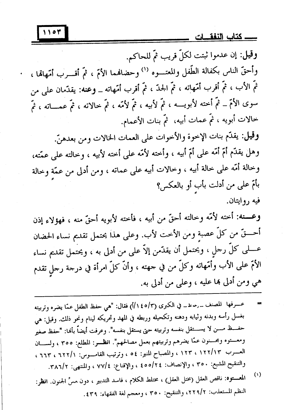 وأحق الناس بكفالة الطفل والمعتوه وحضانهما الأم، ثم أقرب أمهاتها، ثم الأب، ثم أقرب أمهاته، ثم الجد، ثم أقرب أمهاته- وعنه: يقدمان على من سوى الأم- ثم أخته لأبويه، ثم لأبيه، ثم لأمه، ثم خالاته، ثم عماته، ثم خالات أبويه، ثم عمات أبيه، ثم بنات الأعمام.