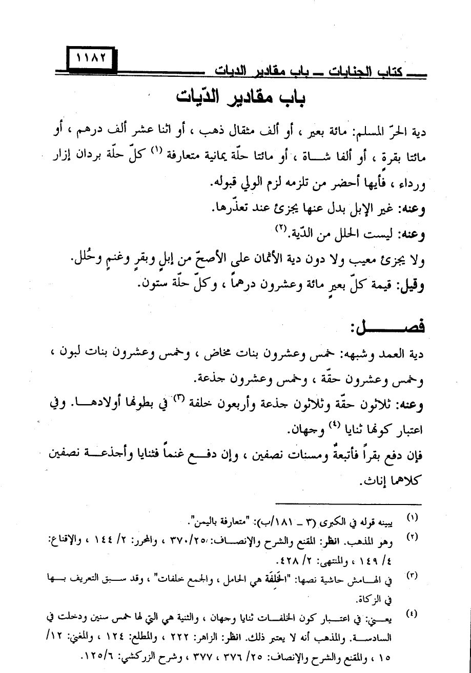 دية الحر المسلم: مائة بعير، أو ألف مثقال ذهب، أو اثنا عشر ألف درهم، أو مائتا بقرة، أو ألفا شاة، او مائتا حلة يمانية متعارفة كل حلة بردان إزار ورداء، فأيها أحضر من تلزمه لزم الولي قبوله.