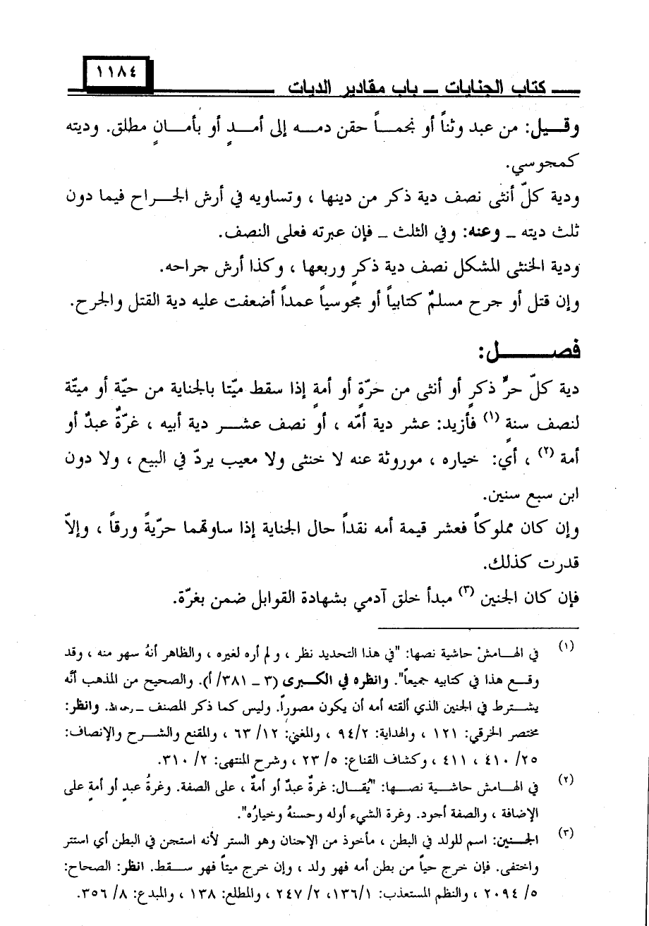دية كل حر ذكي أو أنثى من حرة أو أمة إذا سقط ميتا بالجناية من حية أو ميتة لنصف سنة فأزيد: عشر دية أمه، أو نصف عشر دية أبيه، غرة عبد أو أمة، أي: خياره، موروثة عنه لا خنثى ولا معيب يرد في البيع، ولا دون ابن سبع سنين.