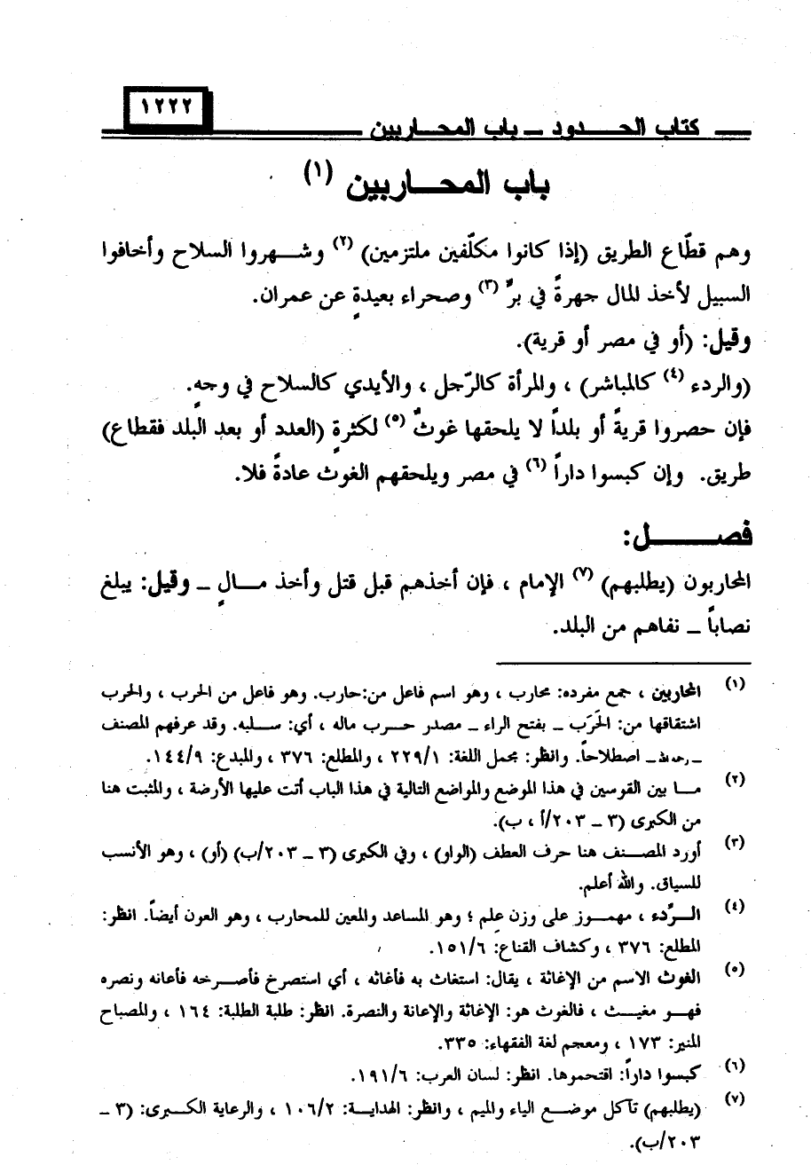 وهم قطاع الطريق (إذا كانوا مكلفين ملتزمين) وشهروا السلاح وأخافوا السبيل لأخذ المال جهرة في بر وصحراء بعيدة عن عمران.