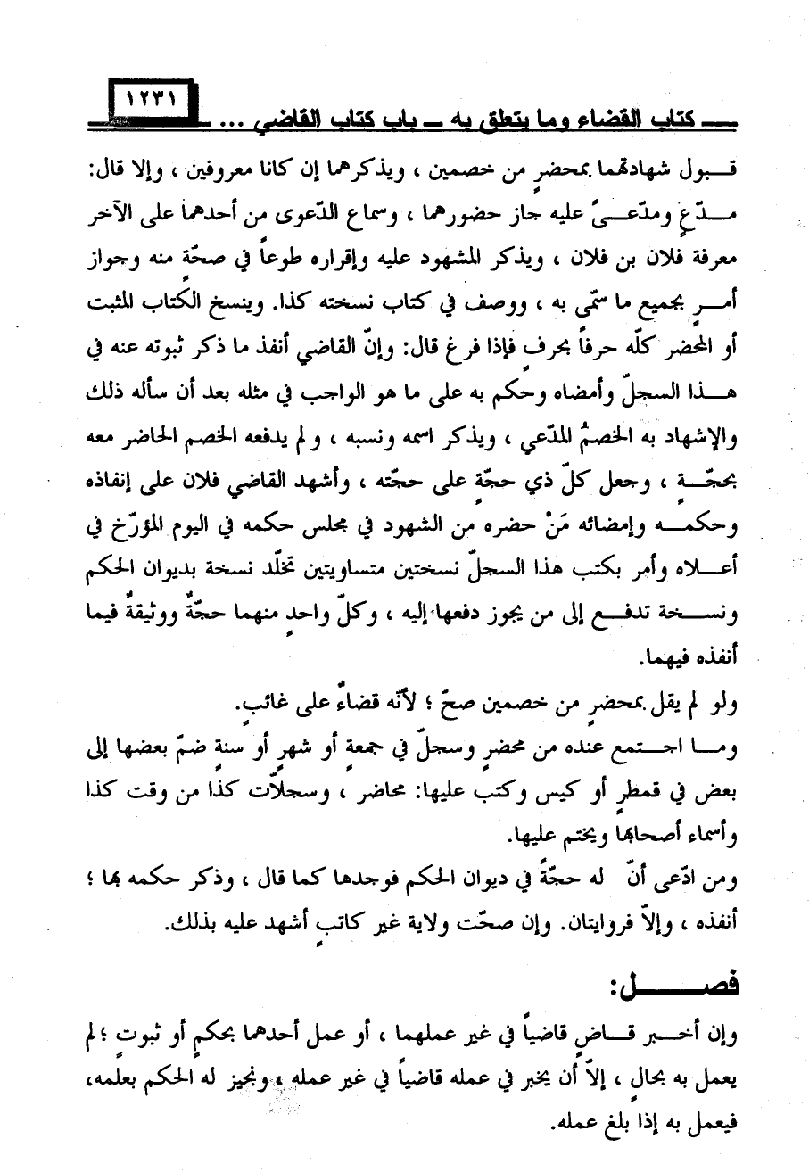 قبول شهادتهما بمحضر من خمصين، ويذكرهما إن كانا معروفين، وإلا قال: مدعٍ ومدعًى عليه جاز حضورهما، وسماع الدعوى من أحدهما على الآخر معرفة فلان بن فلان، ويذكر المشهود عليه وإقراره طوعًا في صحةٍ منه وجواز أمر بجميع ما سمى به، ووصف في كتاب نسخته كذا. وينسخ الكتاب المثبت أو المحضر كله حرفًا بحرفٍ فإذا فرغ قال: وإن القاضي أنفذ ما ذكر ثبوته عنه في هذا السجل وأمضاه وحكم به على ما هو الواجب في مثله بعد أن سأله ذلك والإشهاد به الخصم المدعي، ويذكر اسمه ونسبه، ولم يدفعه الخصم الحاضر معه بحجةٍ، وجعل كل ذي حجةٍ على حجته، وأشهد القاضي فلان على إنفاذه وحكمه وإمضائه من حضره من الشهود في مجلس حكمه في اليوم المؤرخ في أعلاه وأمر بكتب هذا السجل نسختين متساويتين تخلد نسخة بديوان الحكم ونسخة تدفع إلى من يجوز دفعها إليه، وكل واحدٍ منهما حجة ووثيقة فيما أنفذه فيهما.