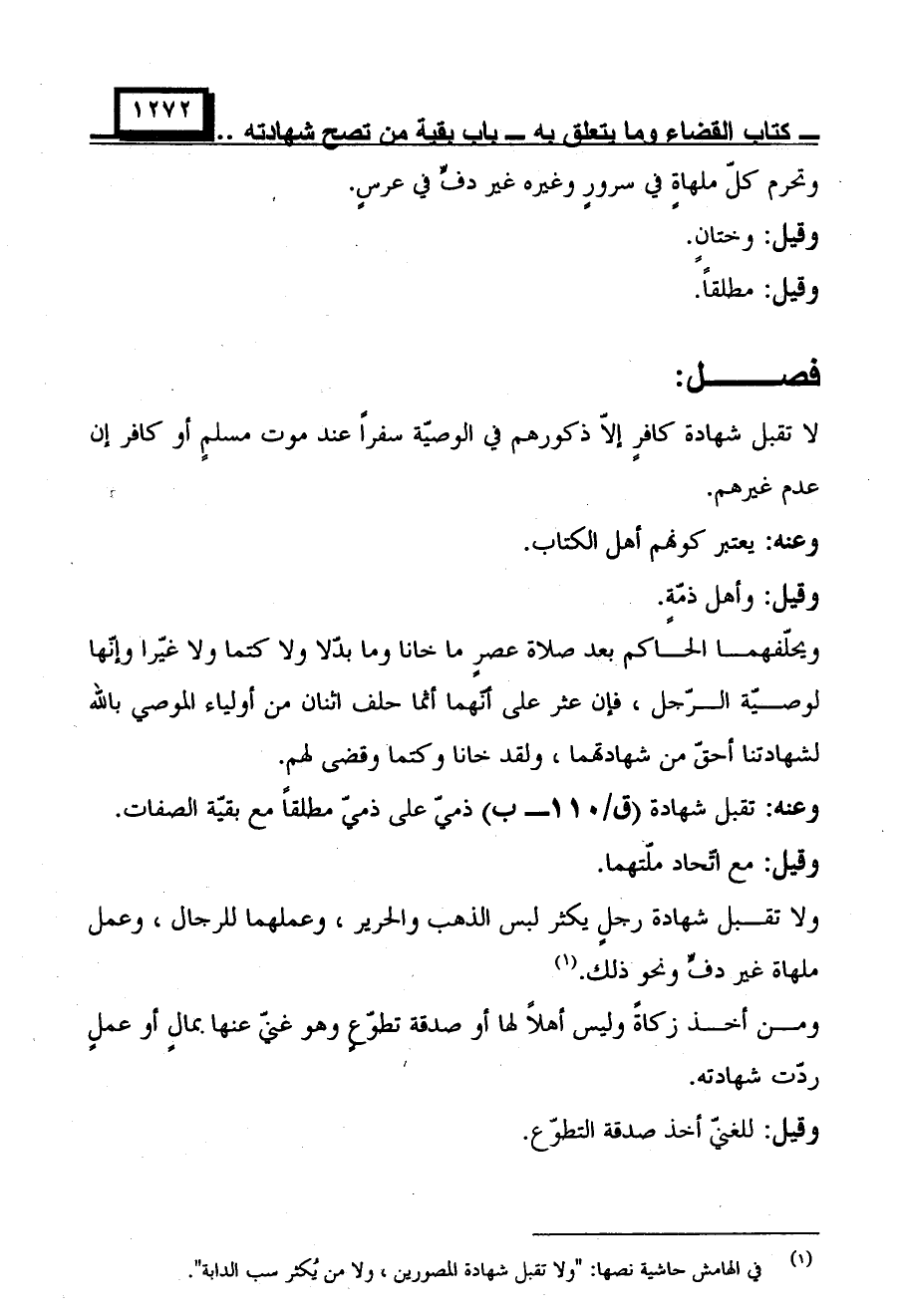 لا تقبل شهادة كافر إلا ذكورهم في الوصية سفرًا عند موت مسلمٍ أو كافر إن عدم غيرهم.