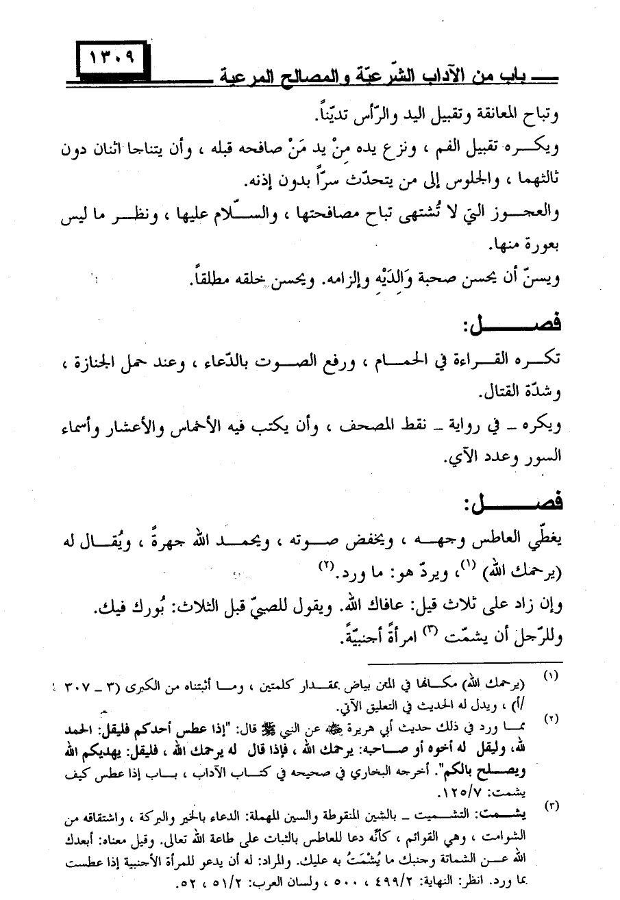 ويكره تقبيل الفم، ونزع يده مِن يد مَن صافحه قبله، وأن يتناجا اثنان دون ثالثهما، والجلوس إلى من يتحدث سرًا بدون إذنه.
