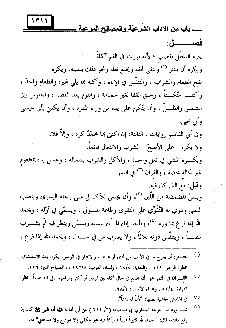 ويكره المشي في نعل واحدة، والأكل والشرب بشماله، وغسل يده بمطعومٍ غير نخالةٍ محضة، والقِران في التمر.