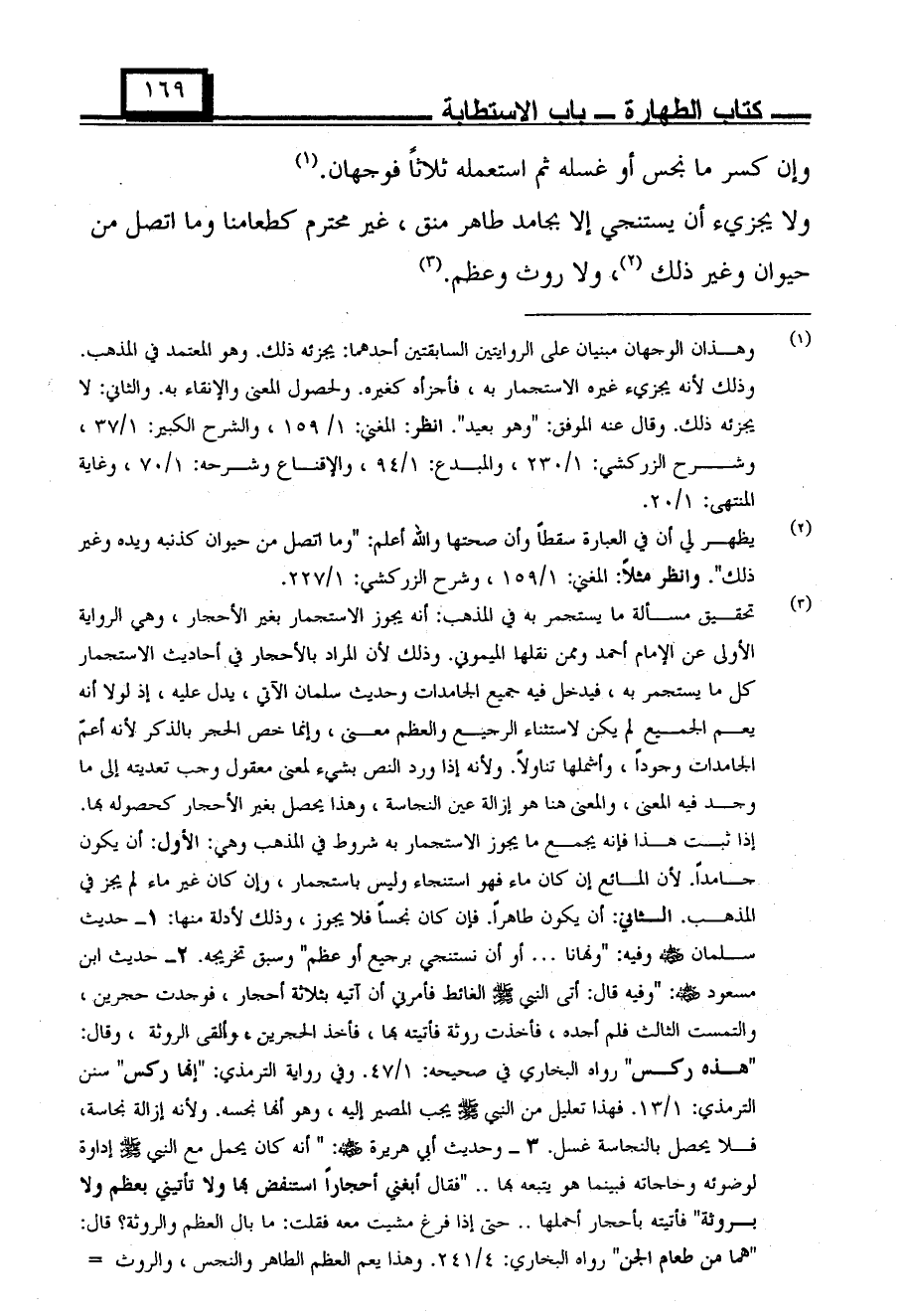 ولا يجزئ أن يستنجي إلا بجامد طاهر منق، غير محترم كطعامنا وما اتصل من حيوان وغير ذلك، ولا روث وعظم.