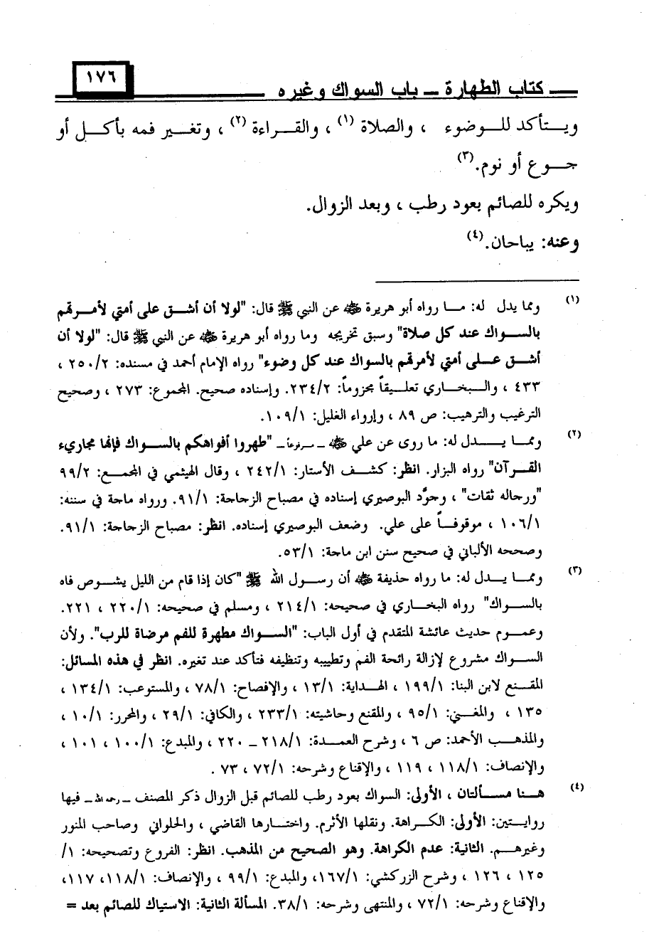 ويتأكد للوضوء، والصلاة، والقراءة، وتغير فمه بأكل أو جوع و نوم.
