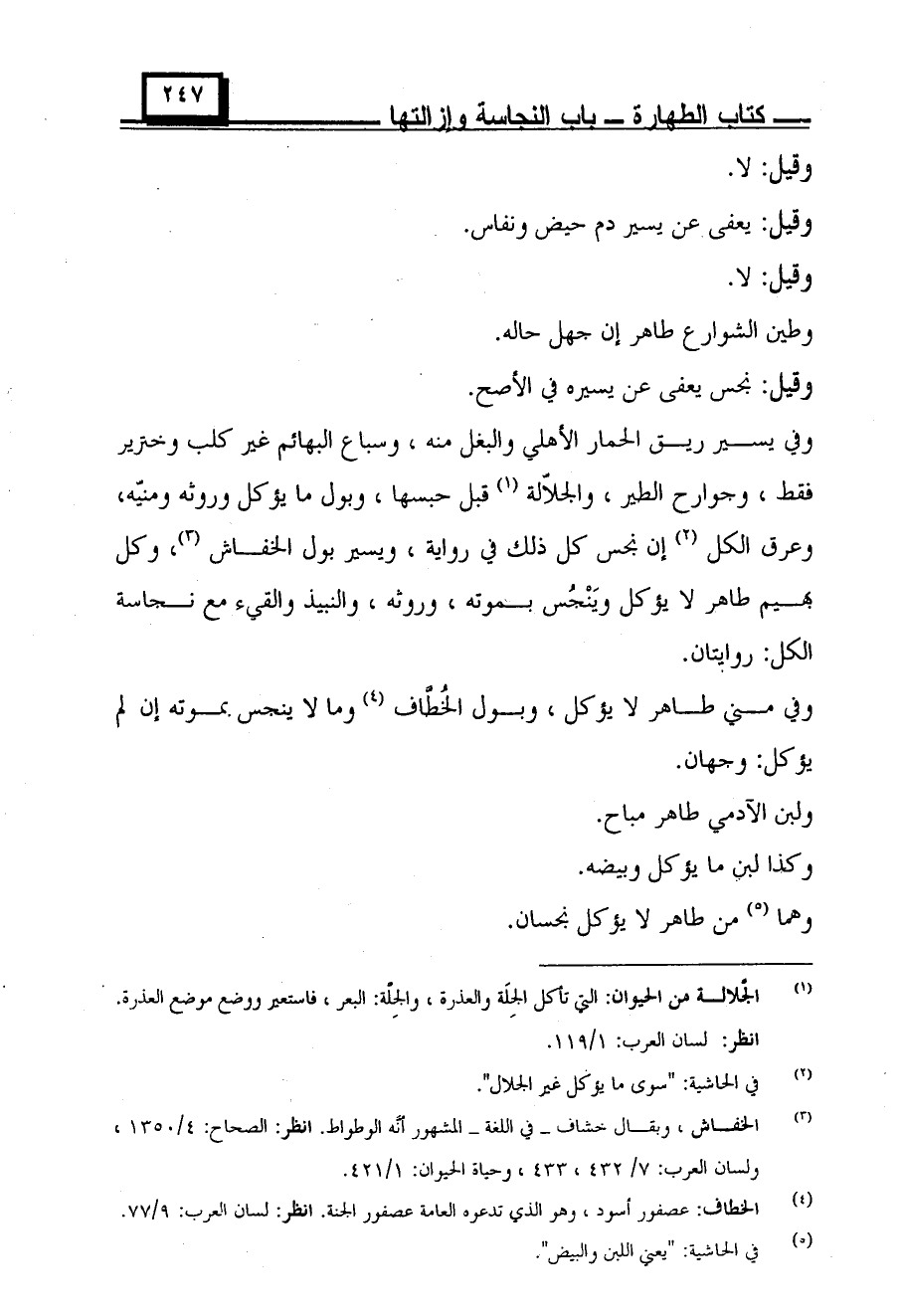 وفي يسير ريق الحمار الأهلي والبغل منه، وسباع البهائم غير كلب وخنزير فقط، وجوارح الطير، والجلالة قبل حبسها، وبول ما سؤكل وروثه ومنيه، وعرق الكل إن نجس كل ذلك في رواية، ويسير بول الخفاش، وكل بهيم طاهر لا يؤكل وينجس بموته، وروثه، والنبيذ والقئ مع نجاسة الكل: روايتان.