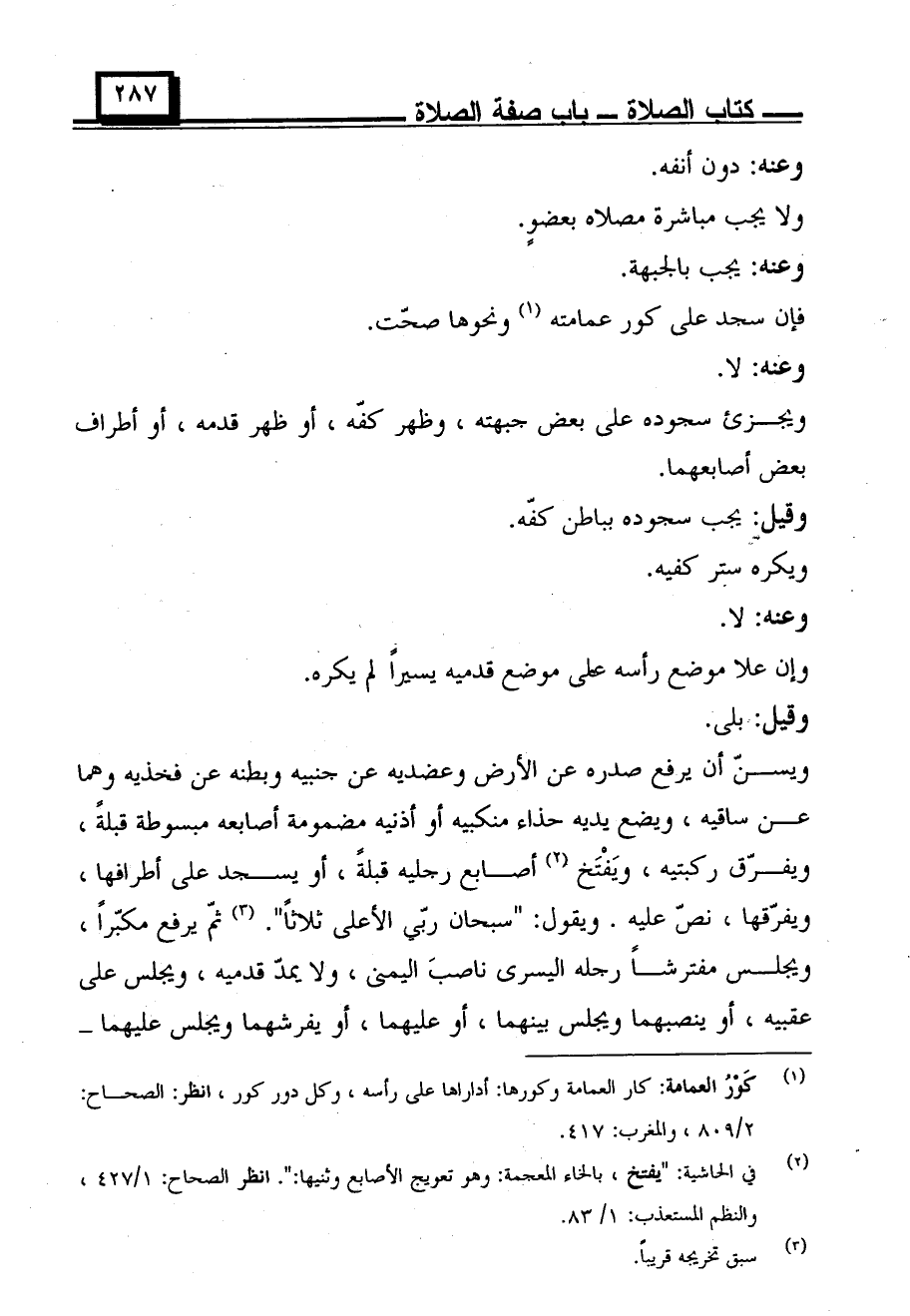 ويسن أن يرفع صدره عن الأرض وعضديه عن جنبيه وبطنه عن فخذيه وهما عن ساقيه، ويضع يديه حذاء منكبيه أو أذنيه مضمومة أصابعه مبسوطة قبلة، ويفرق ركبتيه، ويفتح أصابع رجليه قبلة، أو يسجد على أطرافها، ويفرقها، نص عليه. ويقول: (سبحان ربي الأعلى ثلاثا) ثم يرفع مكبرا، ويجلس مفترشا رجله اليسرى ناصب اليمنى، ولا يمد قدميه، ويجلس على عقبيه، أو ينصبهما ويجلس بينهما، أو عليهما، أو يفرشهما ويجلس عليهما-