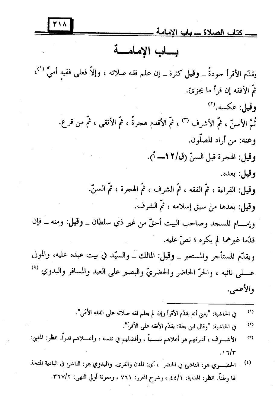 ثم الأسن، ثم الأشرف، ثم الأقدم هجرة، ثم الأتقى، ثم من قرع.