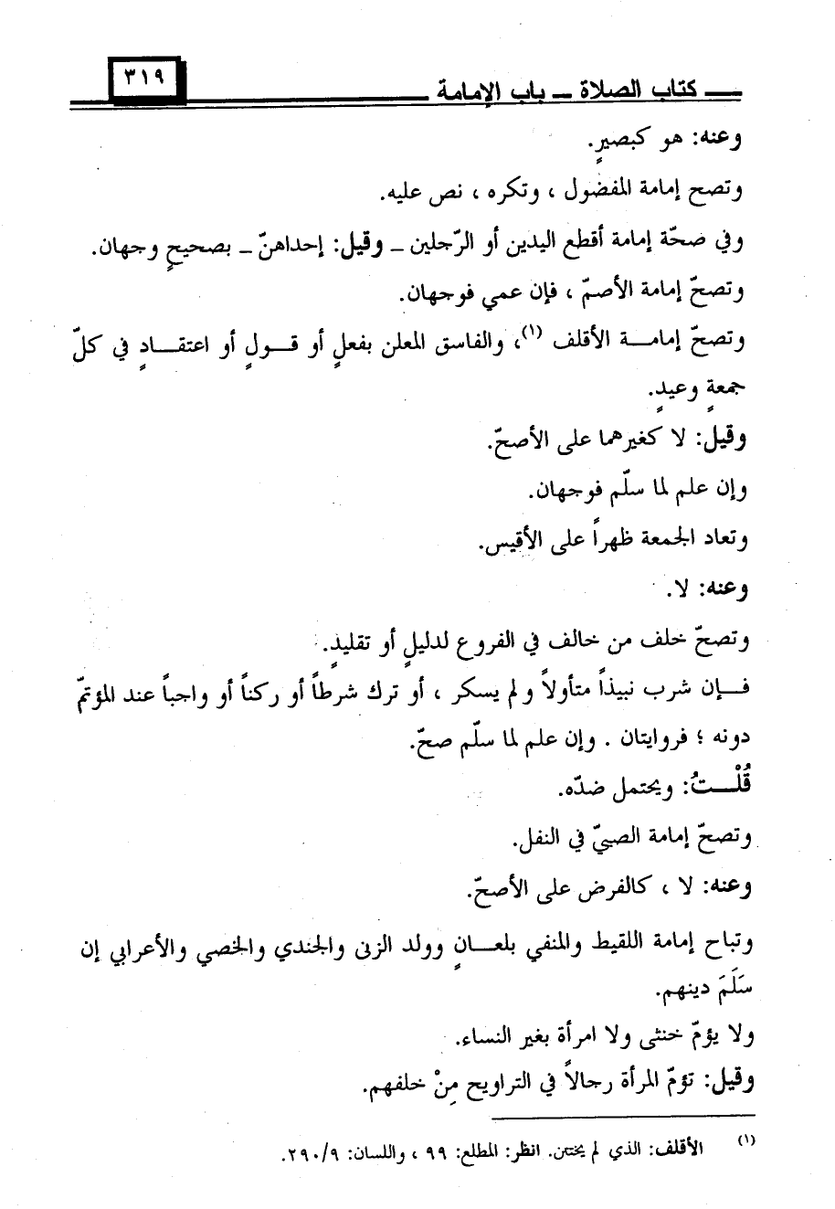 وتباح إمامة اللقيط والمنفي بلعان وولد الزنى والجندي والخصي والأعرابي إن سلم دينهم.