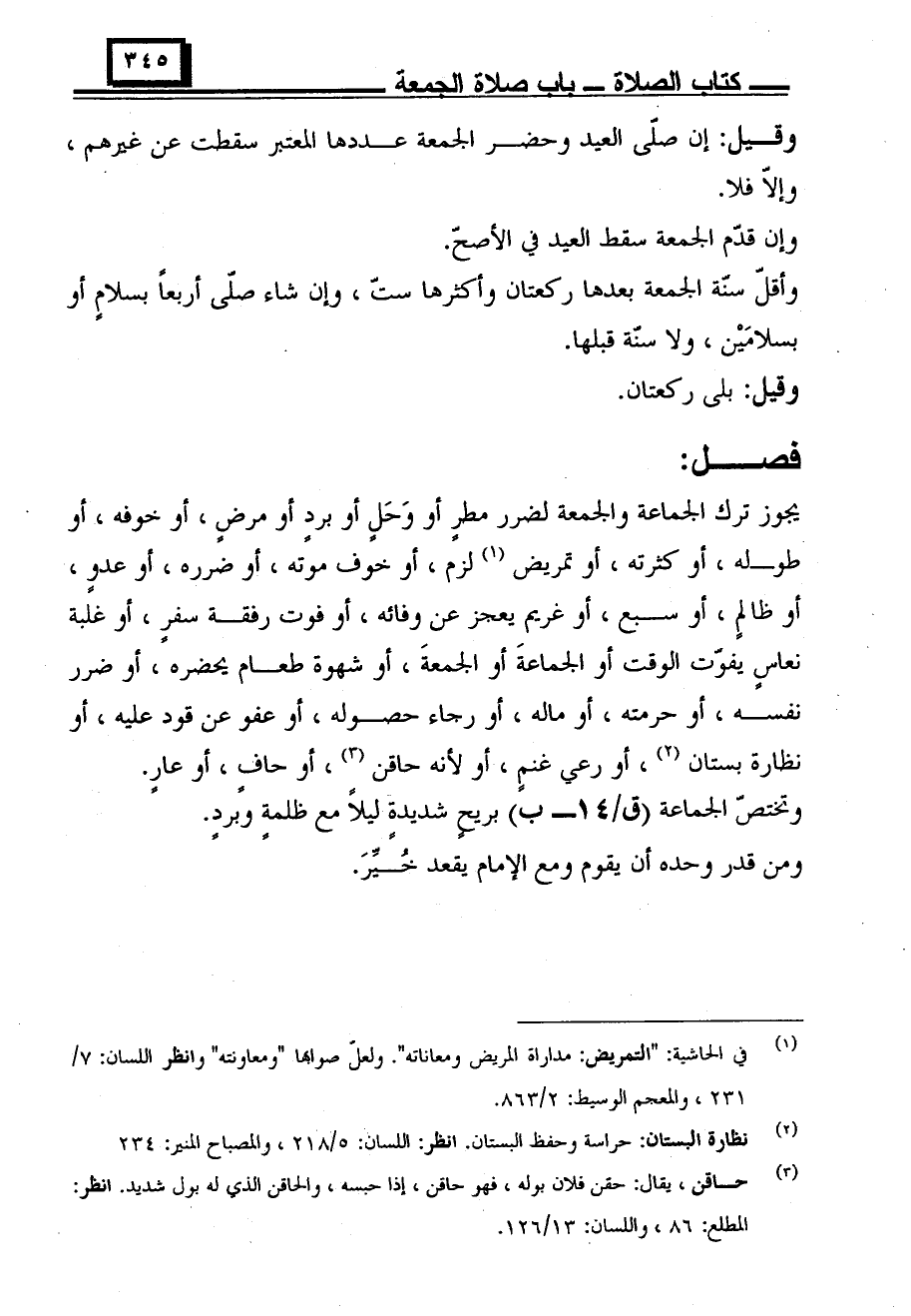 يجوز ترك الجماعة والجمعة لضرر مطٍر أو وحٍل أو برد أو مرٍض، أو خوفه، أو طوله، أو كثرته، أو تمريض لزم، أو خوف موته، أو ضرره، أو عدوٍ، أو ظالٍم، أو سبع، أو غريم يعجز عن وفائه، أو فوت رفقة سفٍر، أو غلبة نعاٍس يفوت الوقت أو الجماعة أو الجمعة، أو شهوة طعام يحضره، أو ضرر نفسه، أو حرمته، أو ماله، أو رجاء حصوله، أو عفو عن قود عليه، أو نظارة بستان، أو رعي غنٍم، أو لأنه حاقٍن، أو حاٍف، أو عاٍر.