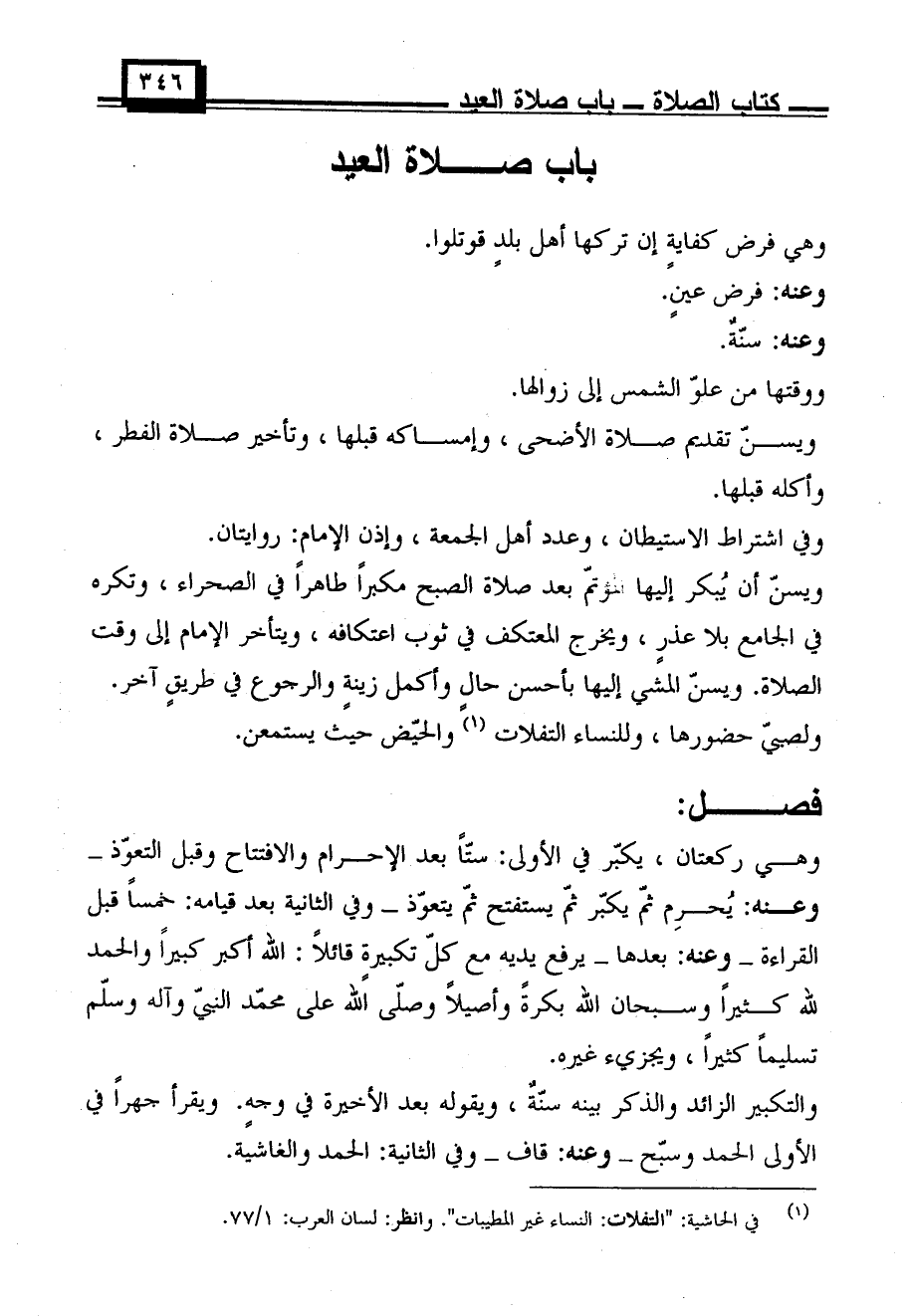 ويسن أن يبكر إليها المؤثم بعد صلاة الصبح مكبرًا طاهرًا في الصحراء، وتكره في الجامع بلا عذٍر، ويخرج المعتكف في ثواب اعتكافه، ويتأخر الإمام إلى وقت الصلاة. ويسن المشي إليها بأحسن حاٍل وأكمل زينٍة والرجوع في طريٍق آخر.