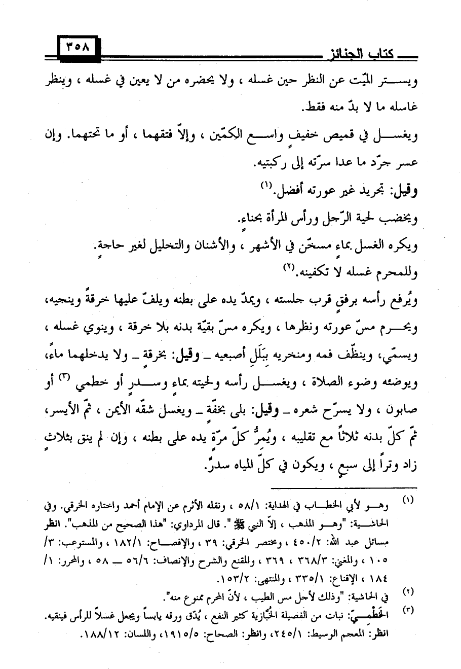 ويرفع رأسه برفقٍ قرب جلسته، ويمد يده على بطنه ويلف عليها خرقة وينجبه، ويحرم مس عورته ونظرها، ويكره مس بقية بدنه بلا خرقة، وينوي غسله، ويسمي، وينظف فمه ومنخريه ببلل أصبعيه- وقيل: بخرقةٍ- ولا يدخلهما ماء ويوضئه وضوء الصلاة، ويغسل رأسه ولحيته بماءٍ وسدرٍ أو خطمي أو صابون، ولا يسرح شعره- وقيل: بلى بخفةٍ- ويغسل شقه الأيمن، ثم الأيسر، ثم كل بدنه ثلاثًا مع تقليبه، ويمر كل مرةٍ يده على بطنه، وإن لم ينق بثلاثٍ زاد وترًا إلى سبعٍ، ويكون في كل المياه سدر.