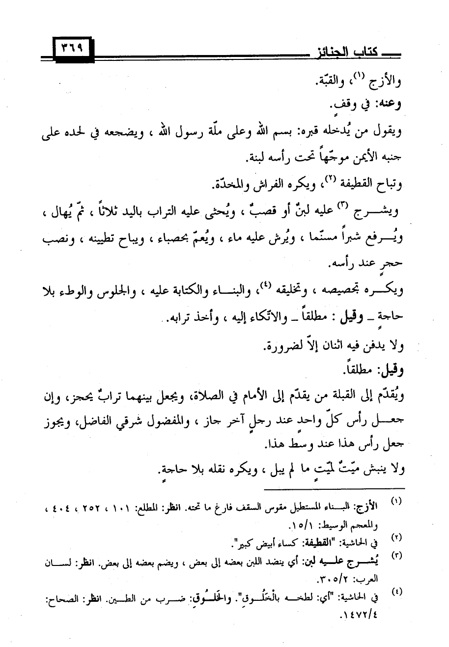 ويقول من يدخله قبره: بسم الله وعلى ملة رسول الله، ويضجعه في لحده على جنبه الأيمن موجهًا تحت رأسه لبنة.