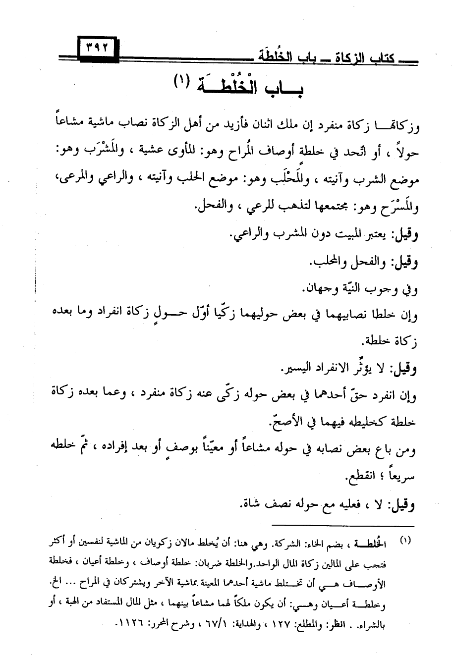 وزكاتها زكاة منفرد إن ملك أثنان فأزيد من أهل الزكاة نصاب ماشية مشاعًا حولًا، أو اتحد في خلطةٍ أوصاف المراح وهو: المأوى عشية، والمشرب وهو: موضع الشرب وآنيته، والمحلب وهو: موضع الحلب وآنيته، والراعي والمرعى، والمسرح وهو: مجتمعها لتذهب للرعي، والفحل.