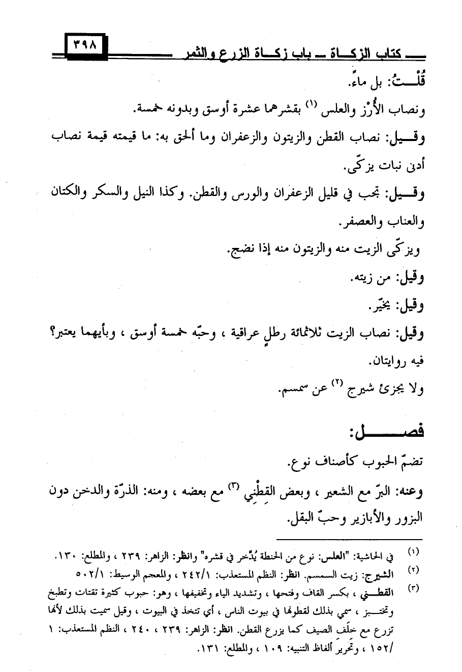 وقيل: نصاب القطن والزيتون والزعفران وما ألحق به: ما قيمته قيمة نصاب أدنى نبات يزكي.