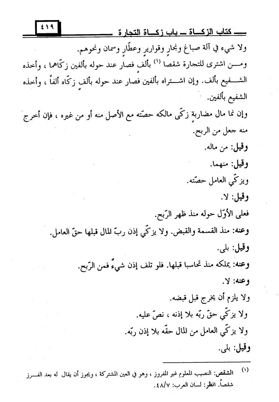 ومن اشترى للتجارة شقصا بألف فصار عند حوله بألفين زكاهما، وأخذه الشفيع بألف. وإن اشتراه بألفين فصار عند حوله بألفٍ زكاه ألفًا، وأخذه الشفيع بألفين.