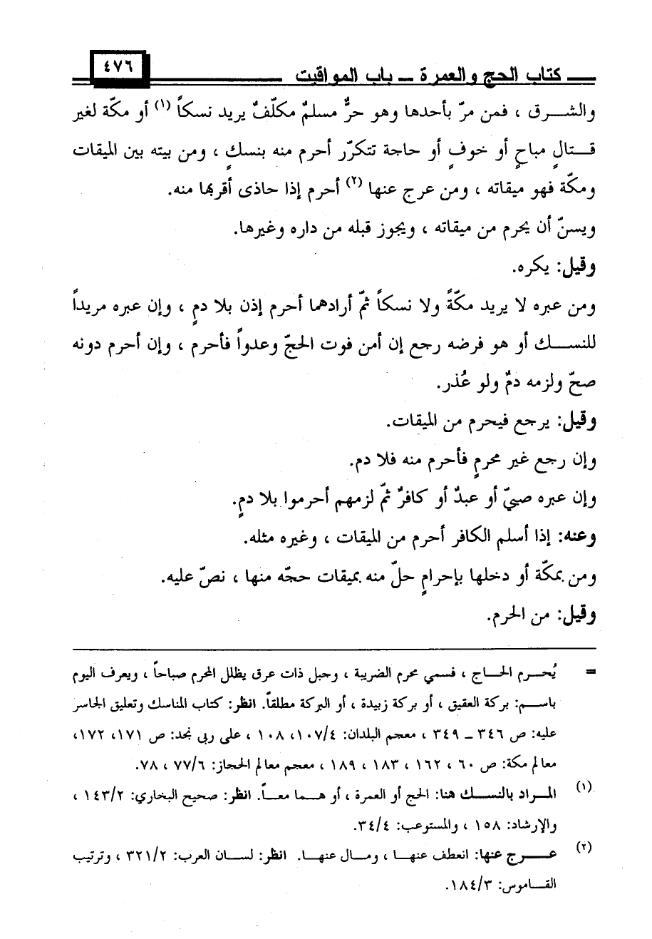والشرق، فمن مر بأحدها وهو حرُ مسلمُ مكلفُ يريد نسكًا أو مكة لغير قتالٍ مباحٍ أو خوفٍ أو حاجة تتكرر أحرم منه بنسكٍ، ومن بيته بين الميقات ومكة فهو ميقاته، ومن عرج عنها أحرم إذا حاذى أقربها منه.