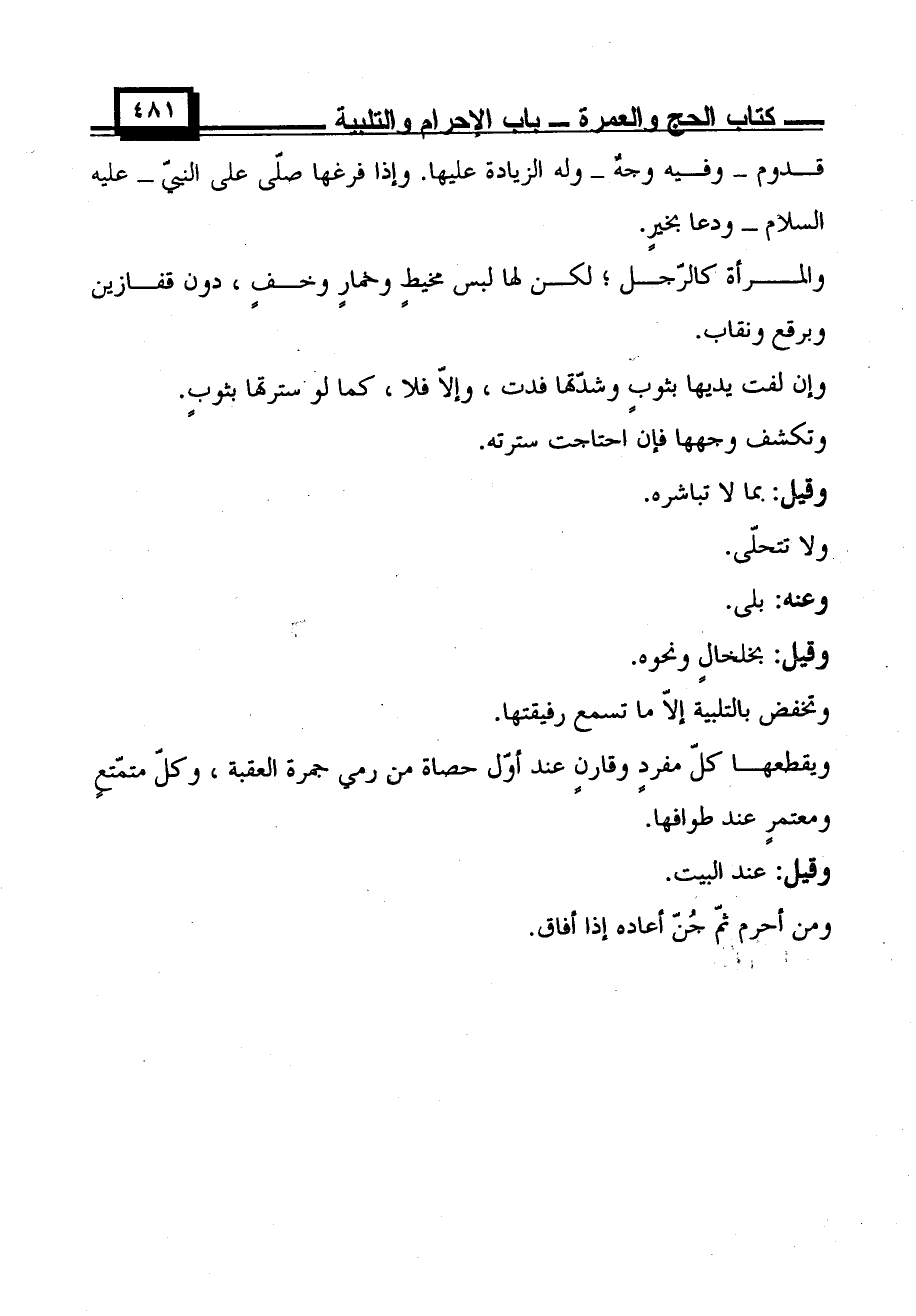 والمرأة كالرجل؛ لكن لها لبس مخيطٍ وخمارٍ وخفٍ، دون قفازين وبرقع ونقاب.