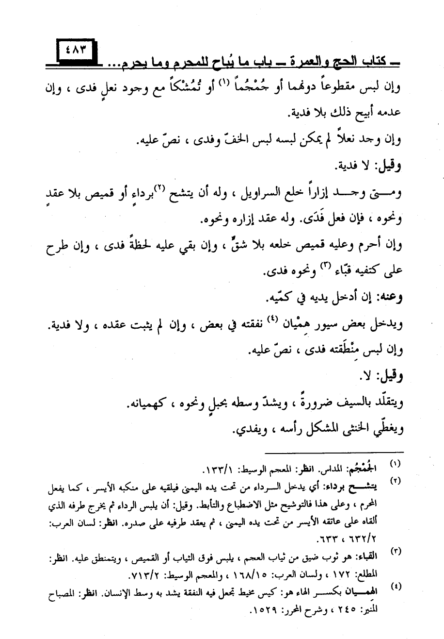 ومتى وجد إزارًا خلع السراويل، وله أن يتشح برداءٍ أو قميص بلا عقدٍ ونحوه، فإن فعل فدى، وله عقد إزاره ونحوه.