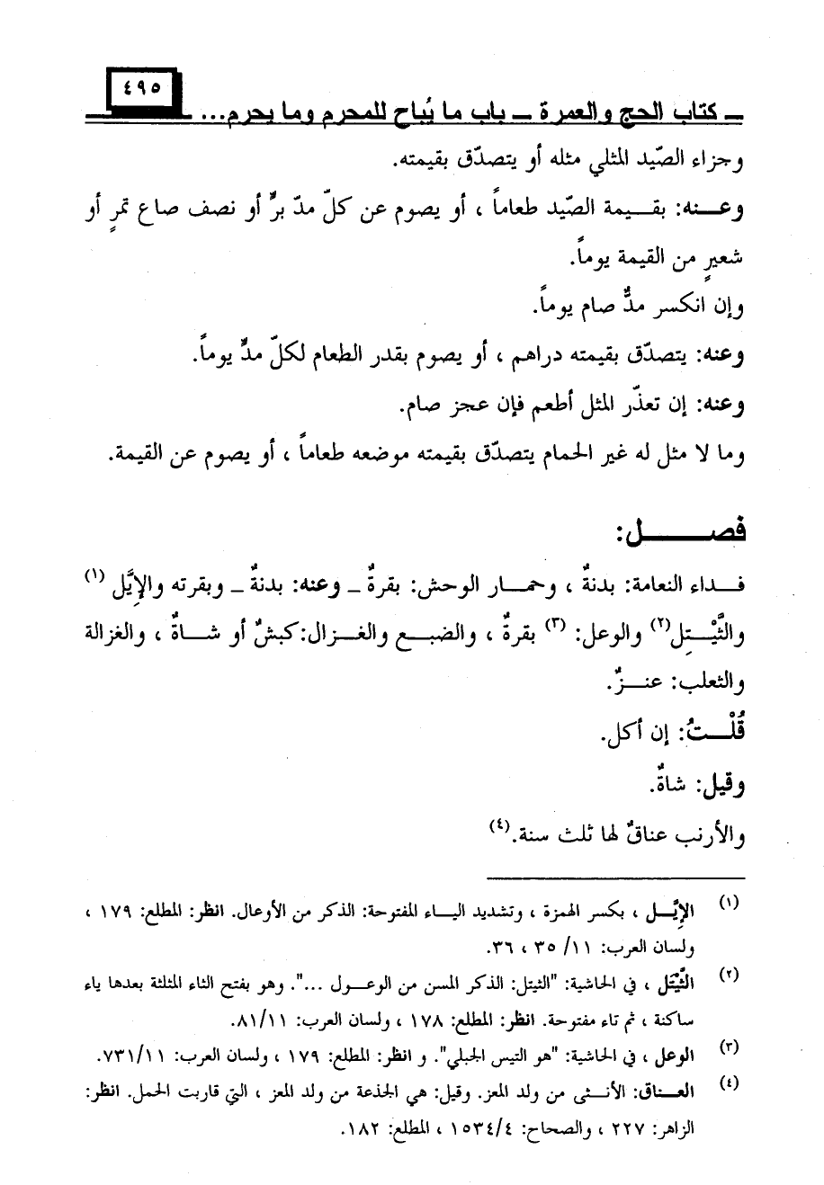 فداء النعامة: بدنة، وحمار الوحش: بقرة- وعنه: بدنة- وبقرته والأيل والثيتل والوعل: بقرة، والضبع والغزال: كبش أو شاة، والغزالة والثعلب: عنز.