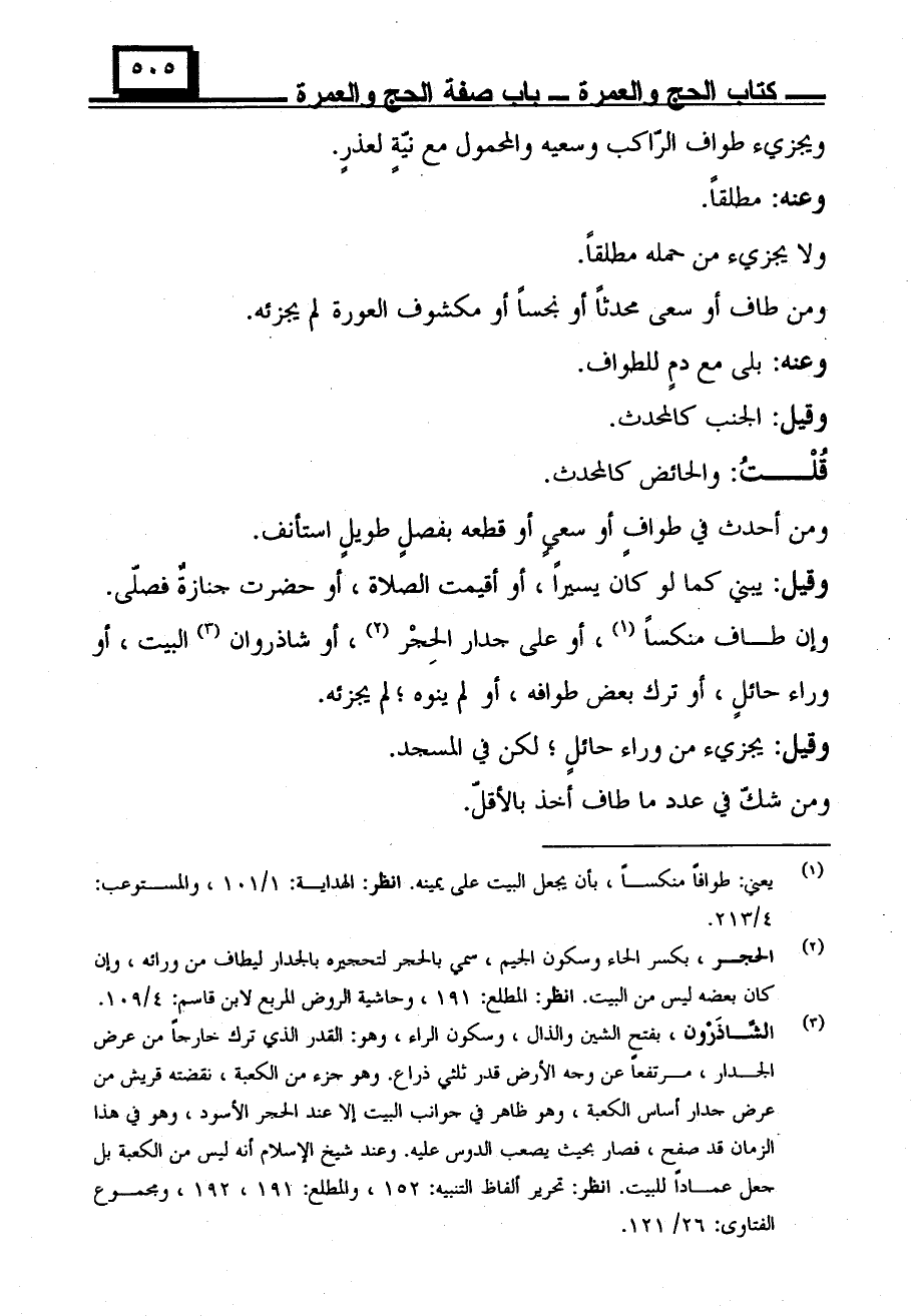 ومن طاف أو سعى محدثًا أو نجسًا أو مكشوف العورة لم يجزئه.