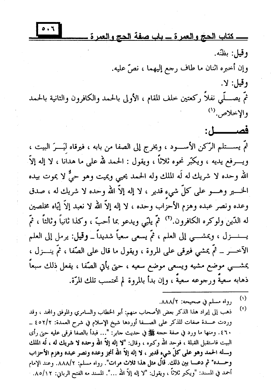 ثم يستلم الركن الأسود، ويخرج إلى الصفا من بابه، فيرقاه لير البيت، ويرفع يديه، ويكبر نحوه ثلاثًا، ويقول: الحمد لله على ما هدانا، لا إله إلا الله وحده لا شريك له له الملك وله الحمد يحيي ويميت وهو حيٌ لا يموت بيده الخير وهو على كل شيءٍ قدير، لا إله إلا الله وحده لا شريك له، صدق وعده ونصر عبده وهزم الأحزاب وحده، لا إله إلا الله لا نعبد إلا إياه مخلصين له الدين ولو كره الكافرون. ثم يلبي ويدعو بما أحب، وكذا ثانيًا وثالثًا، ثم ينزل، ويمشي إلى العلم، ثم يسعى سعيًا شديدًا- وقيل: يرمل إلى العلم الآخر- ثم يمشي فيرقى على المروة، ويقول ما قال على الصفا، ثم ينزل، يمشي موضع مشيه ويسعى موضع سعيه، حتى يأتي الصفا، يفعل ذلك سبعًا ذهابه سعيةٌ ورجوعه سعية، وإن بدأ بالمروة لم تحتسب تلك المرة.