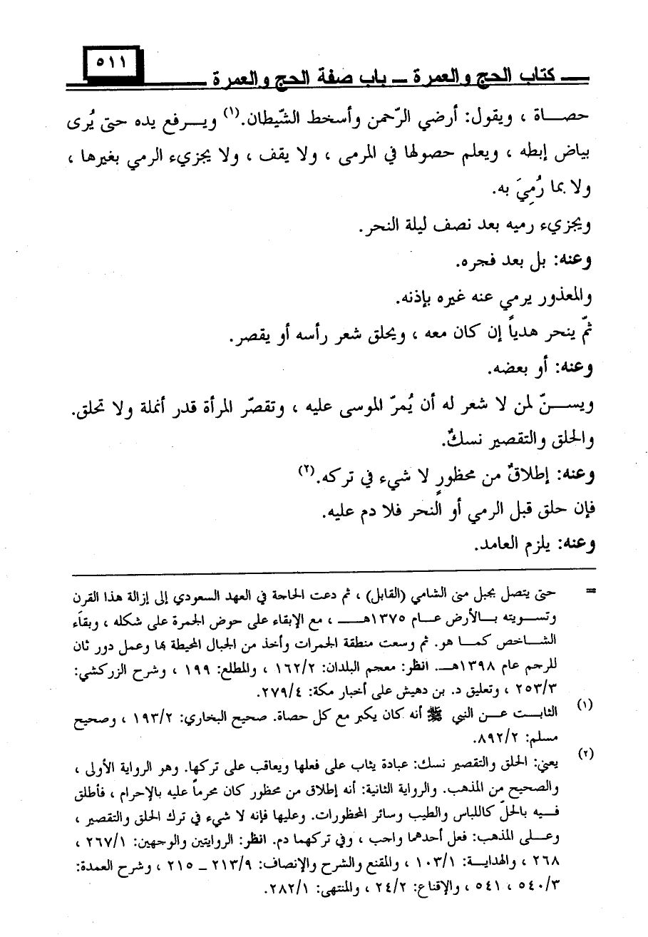 ويسن لمن لا شعر له أن يمر الموسى عليه، وتقصر المرأة قدر أنملة ولا تحلق والحلق والتقصير نسك.