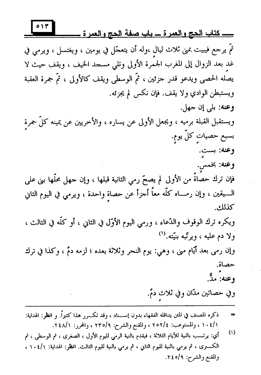 ثم يرجع فيبيت بمنى ثلاث ليالٍ، وله أن يتعجل في يومين، ويغتسل، ويرمي في غد بعد الزوال إلى المغرب الجمرة الأولى وتلي مسجد الخيف، ويقف حيث لا يصله الحصى ويدعو قدر جزئين، ثم الوسطى ويقف كالأولى، ثم جمرة العقبة ويستبطن الوادي ولا يقف. فإن نكس لم يجزئه.