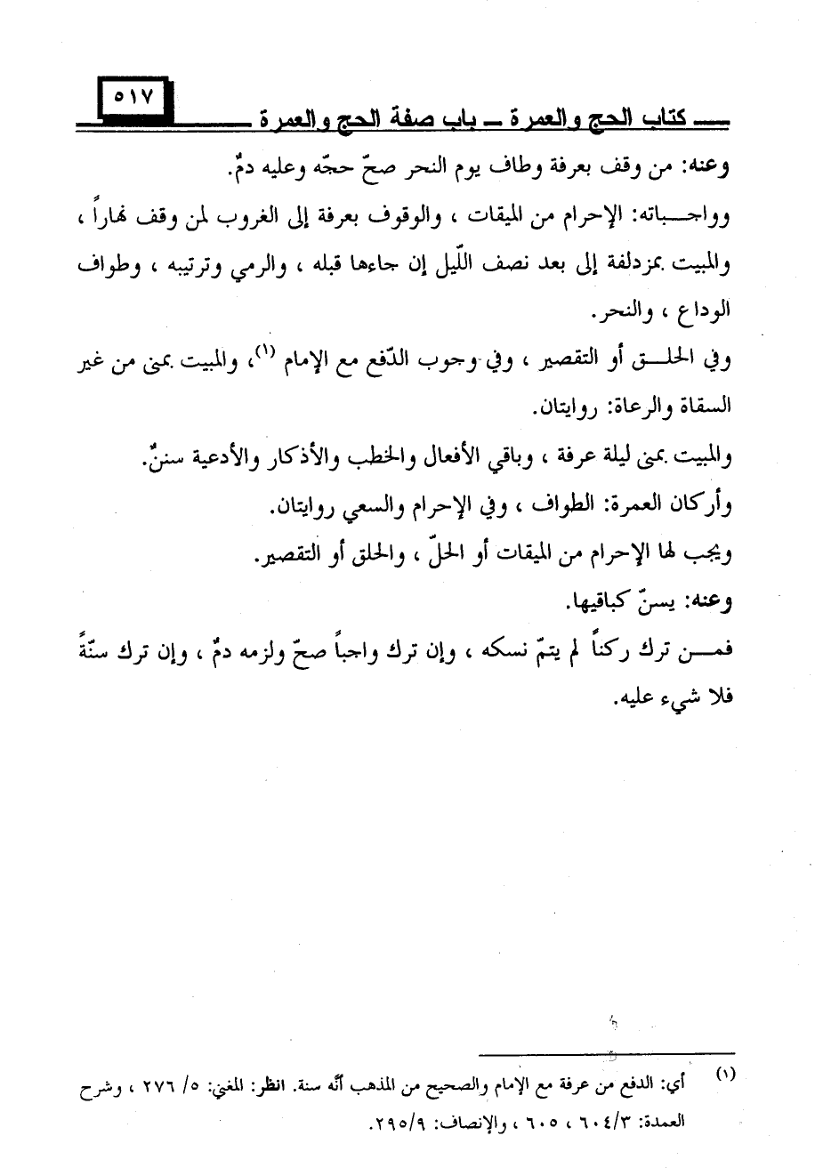 وواجباته: الإحرام من الميقات، والوقوف بعرفة إلى الغروب لمن وقف نهارًا، والمبيت بمزدلفة إلى بعد نصف الليل إن جاءها قبله، والرمي وترتيبه، وطواف الوداع، والنحر.