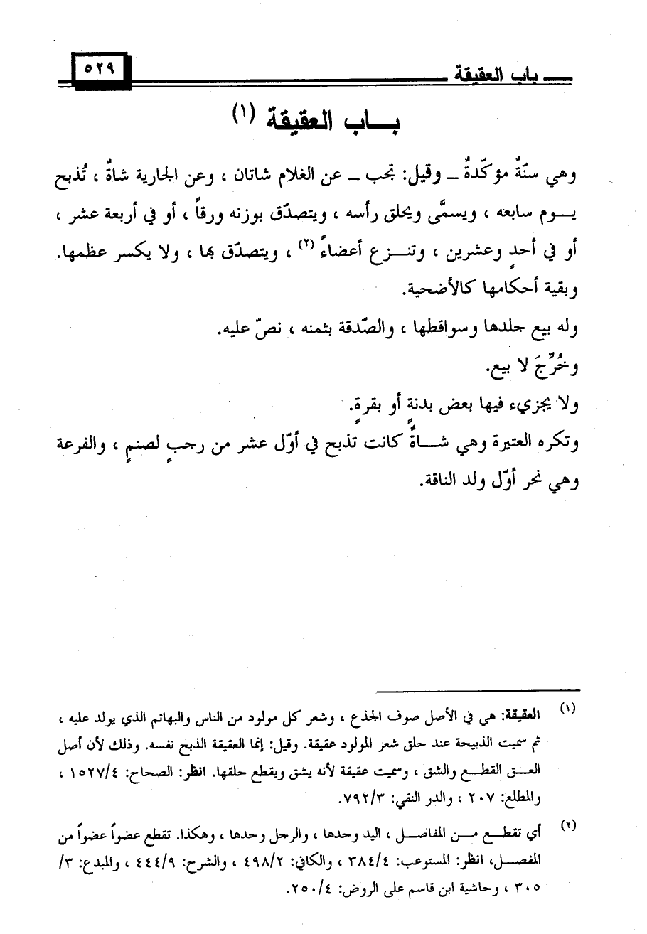 وهي سنة مؤكدة- وقيل: تجب- عن الغلام شاتان، وعن الجارية شاةٌ، تذبح يوم سابعه، ويسمى ويحلق رأسه، ويتصدق بوزنه ورقًا، أو في أربعة عشر، أو في أحد وعشرين، وتنزع أعضاءً، ويتصدق بها، ولا يكسر عظمها. وبقية أحكامها كالأضحية.