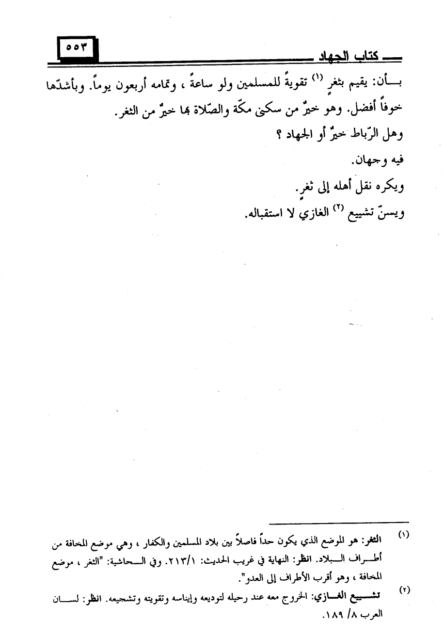 بأن: يقيم بثغرٍ تقويةً للمسلمين ولو ساعةً، وتمامه أربعون يومًا. وبأشدها خوفًا أفضل. وهو خيرٌ من سكنى مكة والصلاة بها خيرٌ من الثغر.