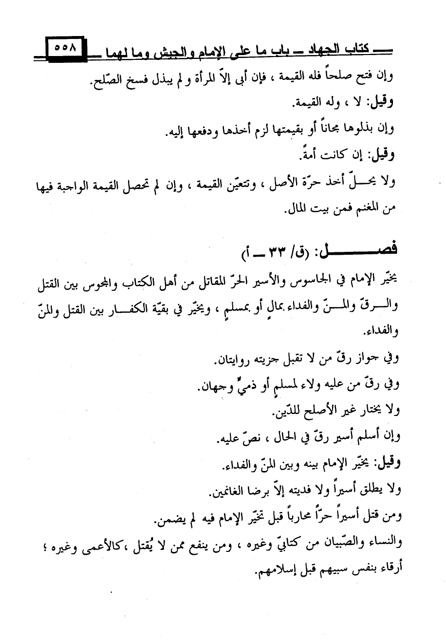 يخير الإمام في الجاسوس والأسير الحر المقاتل من أهل الكتاب والمجوس بين القتل والرق والمن والفداء بمالٍ أو بمسلمٍ، ويخير في بقية الكفار بين القتل والمن والفداء.